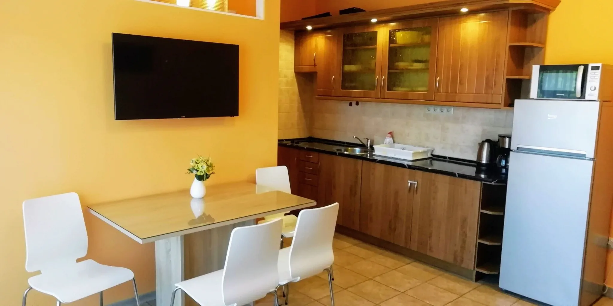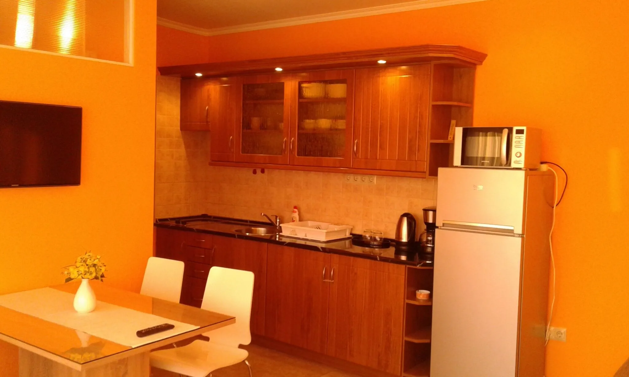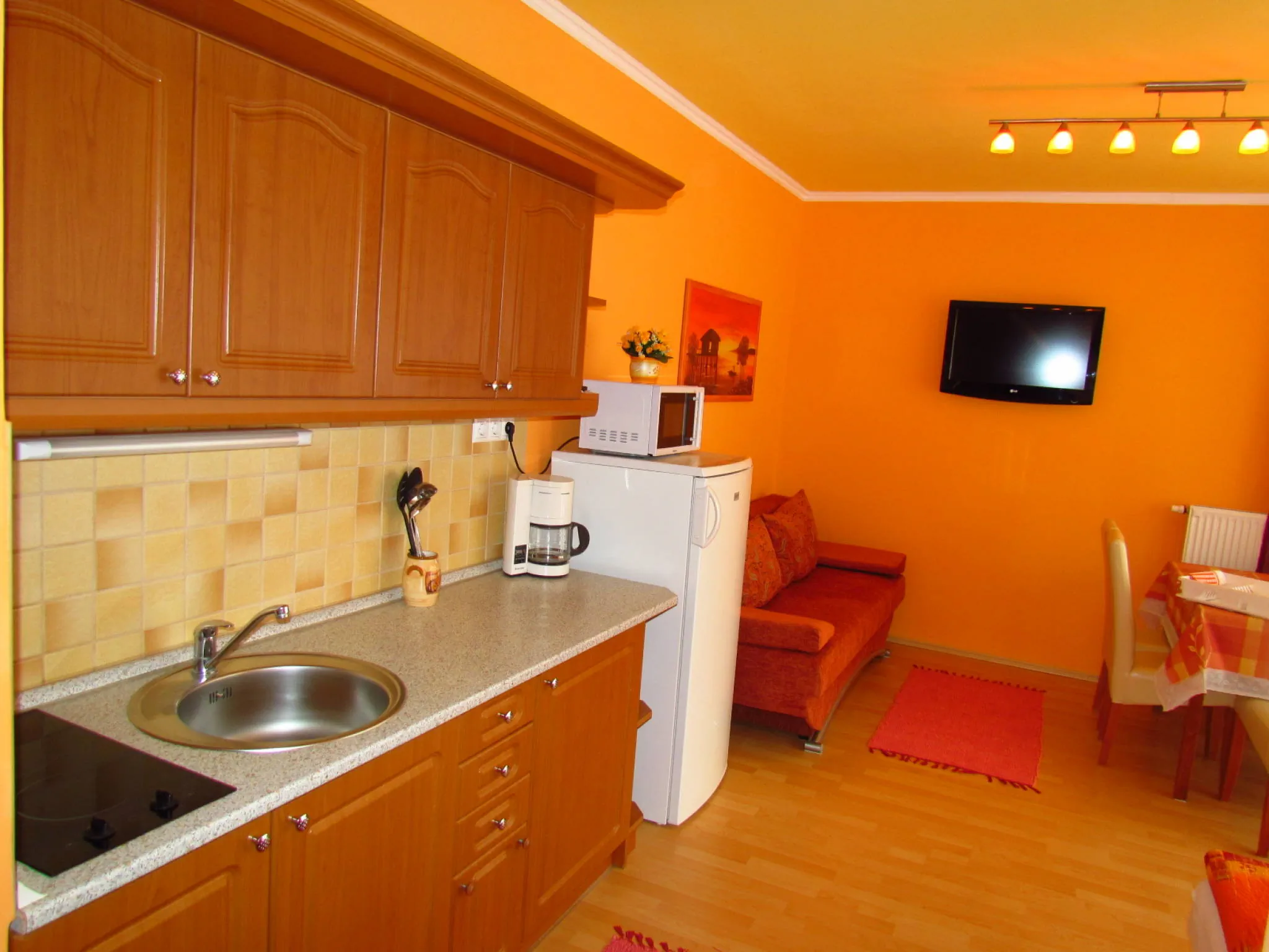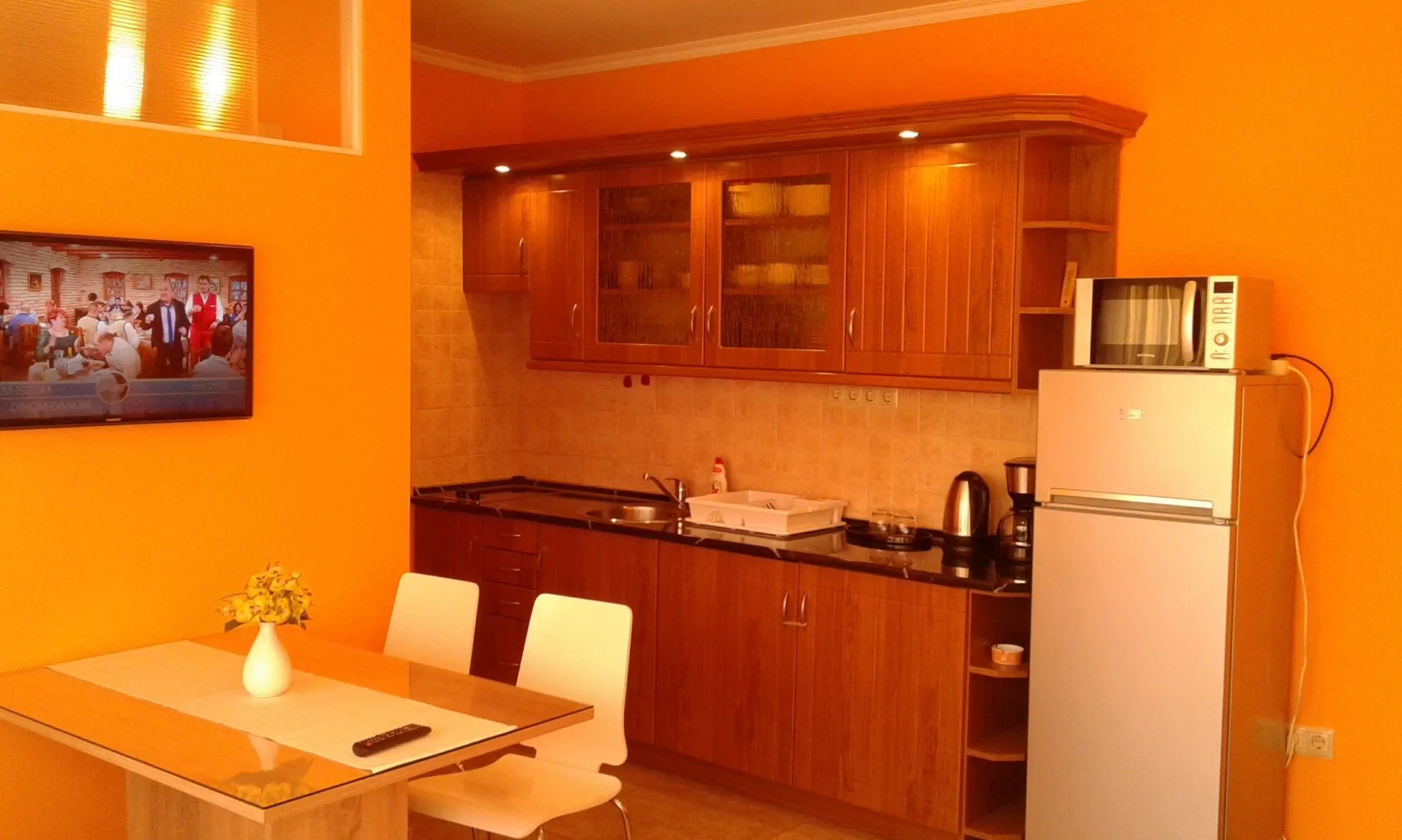 Jól felszerelt amerikai konyhás nappali étkezővel, főzési lehetőség ( elektromos tűzhely, hűtőszekrény, mikró, kávéfőző,kenyérpirító, vízforraló és konyhai kiegészítők,edények,tányérok,poharak,evőeszközök, stb. ) . Téli időszakban az apartman fűthető( központi fűtés).