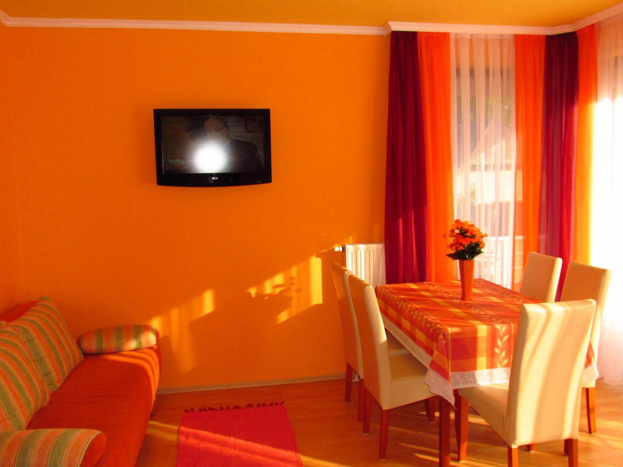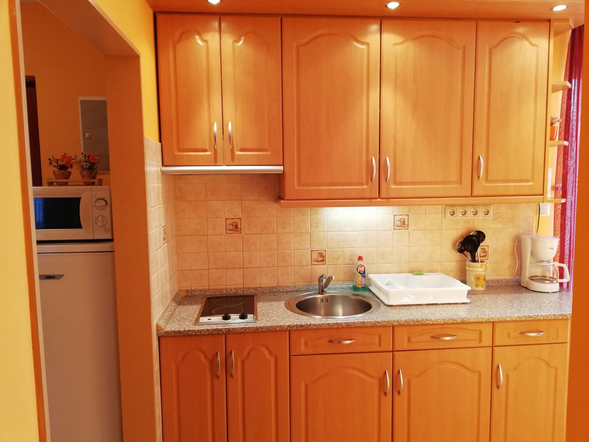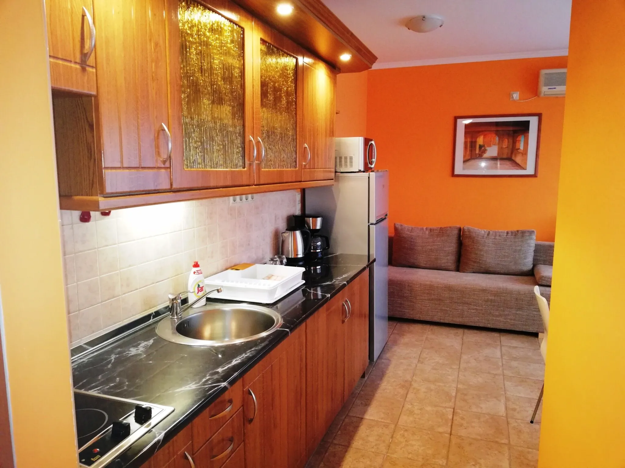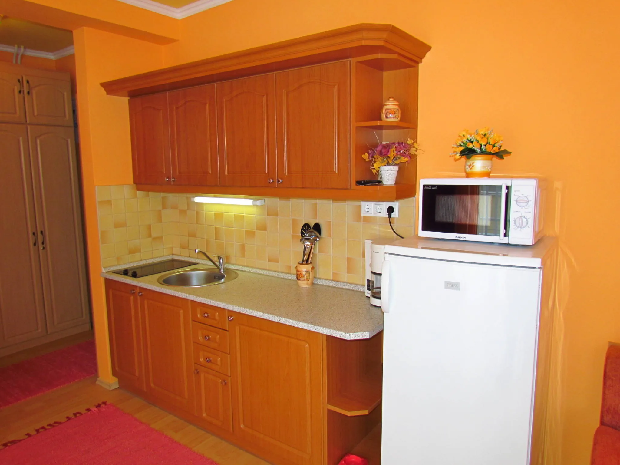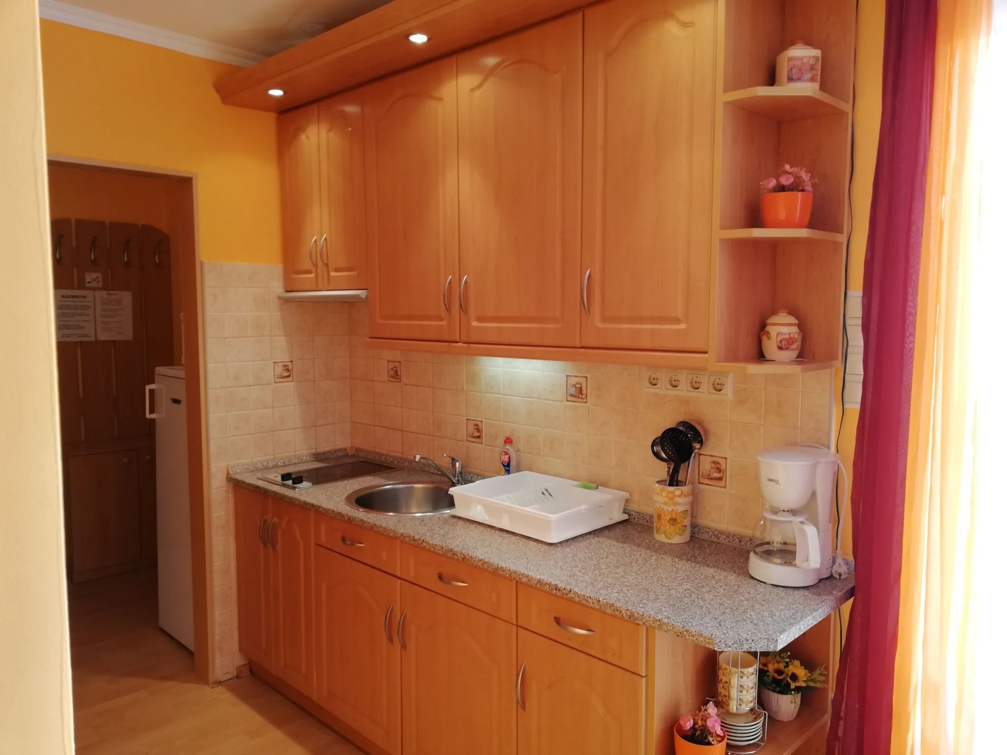 Jól felszerelt amerikai konyhás nappali étkezővel, főzési lehetőség ( elektromos tűzhely, hűtőszekrény, mikró, kávéfőző,kenyérpirító, vízforraló és konyhai kiegészítők,edények,tányérok,poharak,evőeszközök, stb. ) . Téli időszakban az apartman fűthető( központi fűtés).