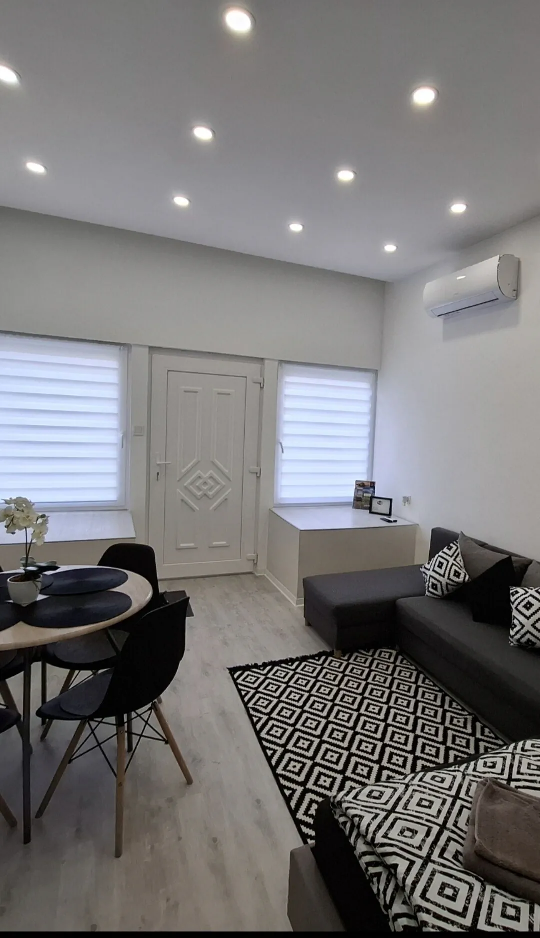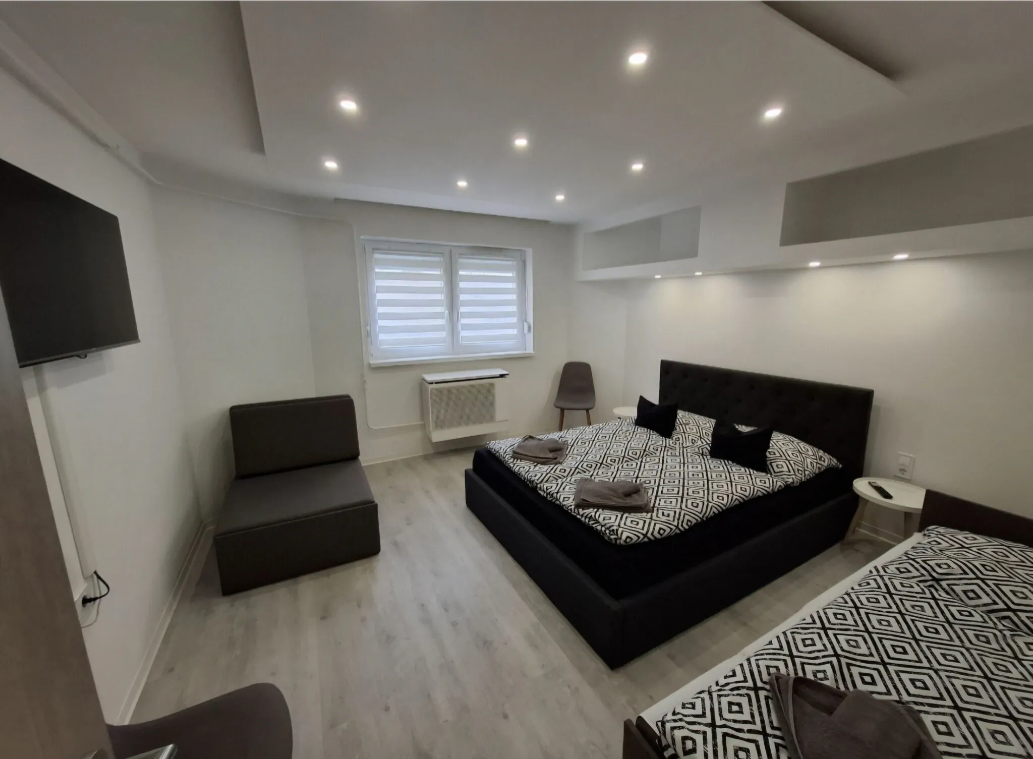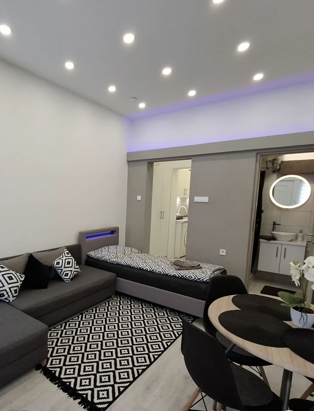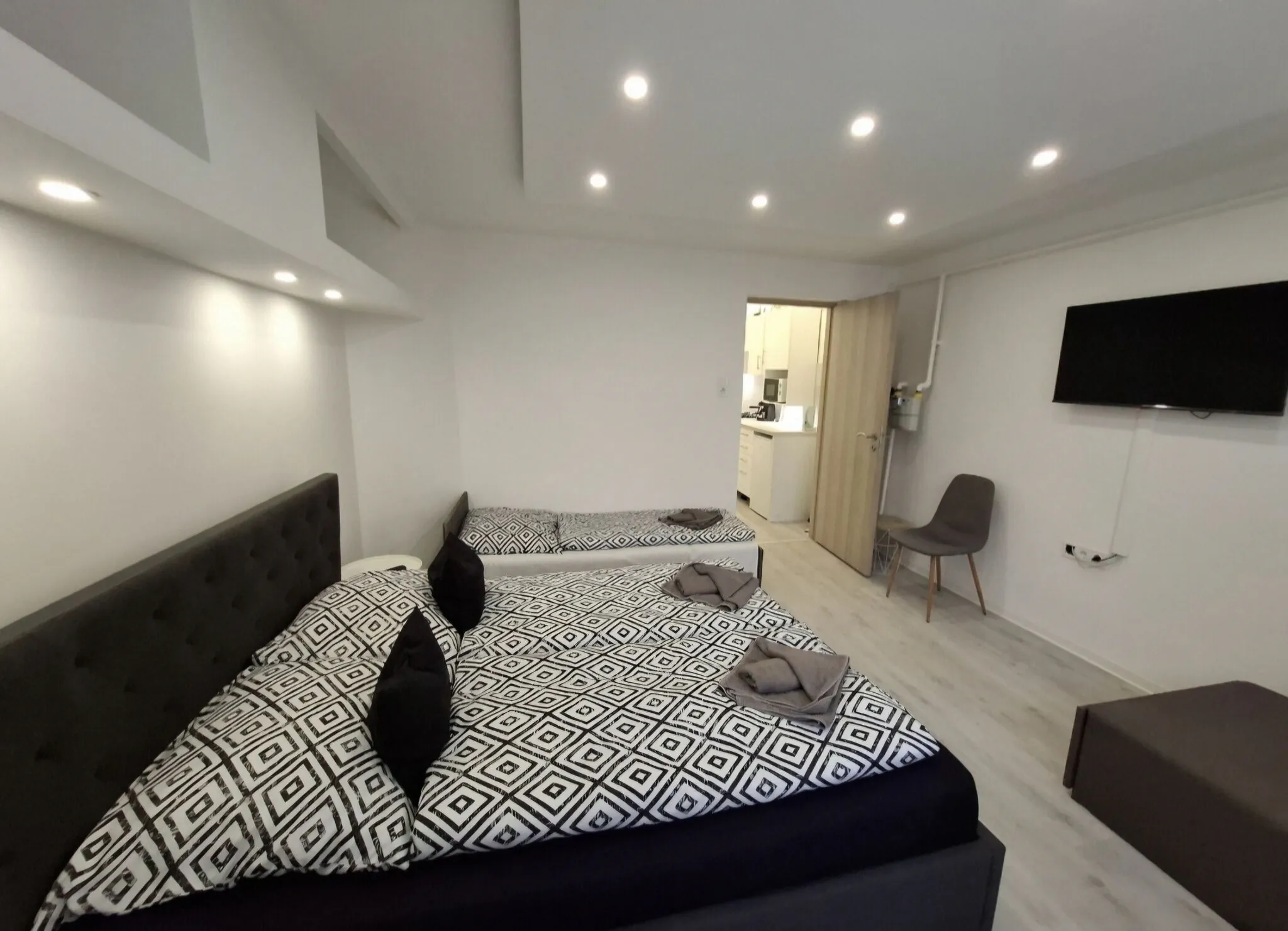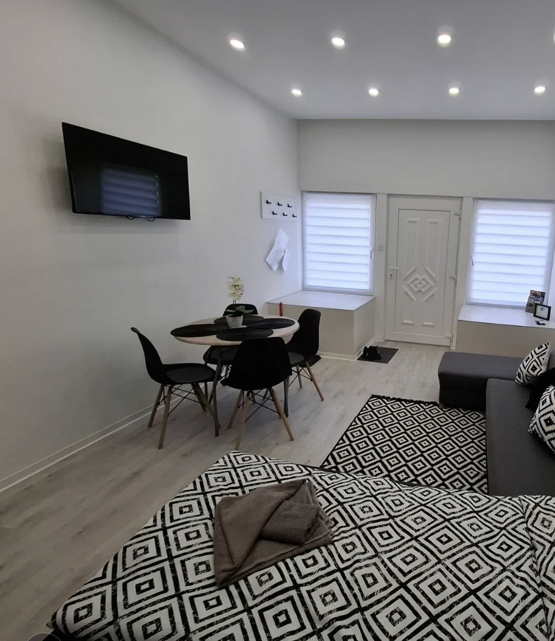 Az apartmanba belépve rögtön a nappaliban találjuk magunkat, itt kapott helyet az étkező rész kialakítása is, illetve az itt található kihúzható sarokkanapé 2 fő részére fekhelyet is biztosít. Síkképernyős HD LED tv került itt elhelyezésre, este pedig a LED-fal gondoskodik a vendégek hangulatos pihenésről.