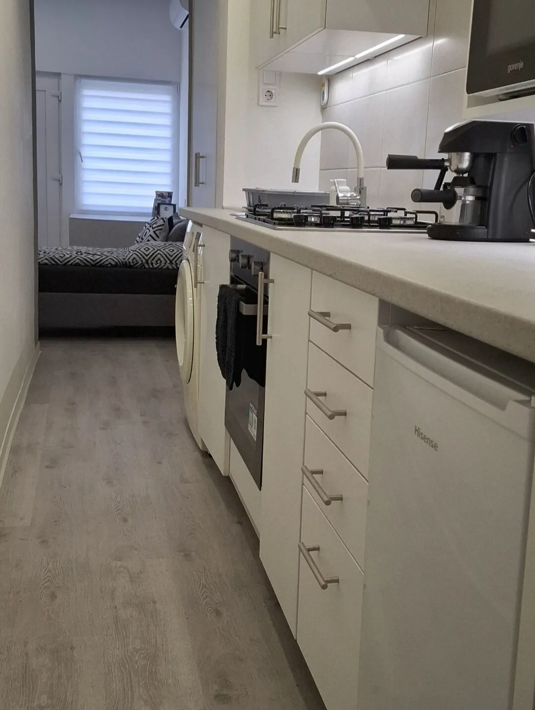 A nappaliból tovább haladva érkezünk a konyhába, amely jól felszerelt konyhai gépekkel: gáztűzhely elektromos sütővel, mikrohullámú sütő, hűtőszekrény, elektromos kávéfőző, mosógép és konyhai eszközökkel egyaránt.