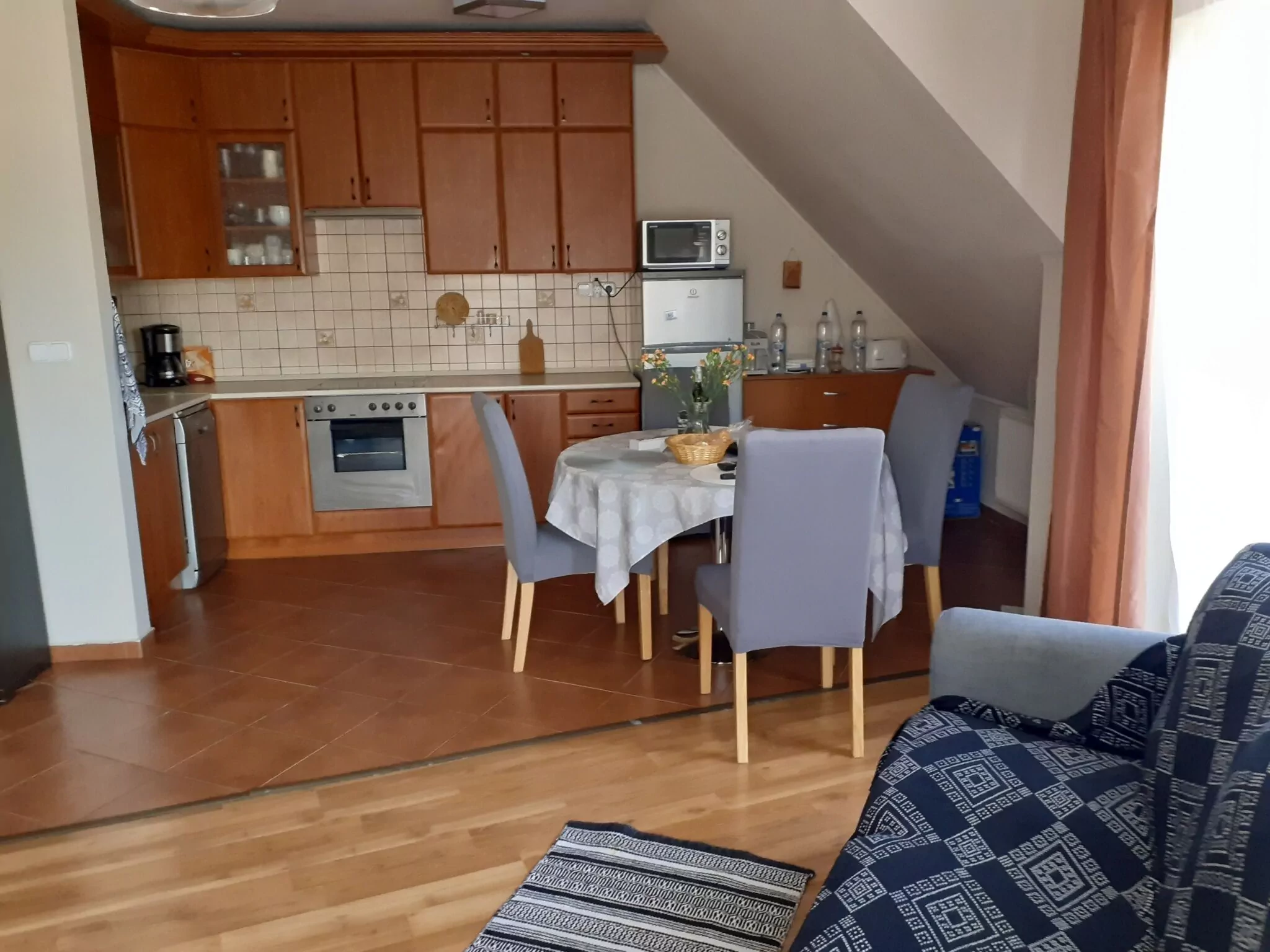 A konyha jól felszerelt, főzési lehetőséget nyújt az aktív nyaralók számára. Nyitott térben kényelmesen elfogyaszthatod az ételt, de ha pihenésre vágysz, csak egy lépés és máris kellemes hangulatú éttermeket találsz.