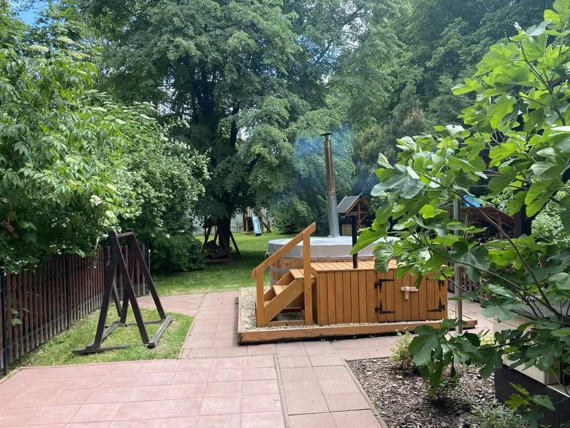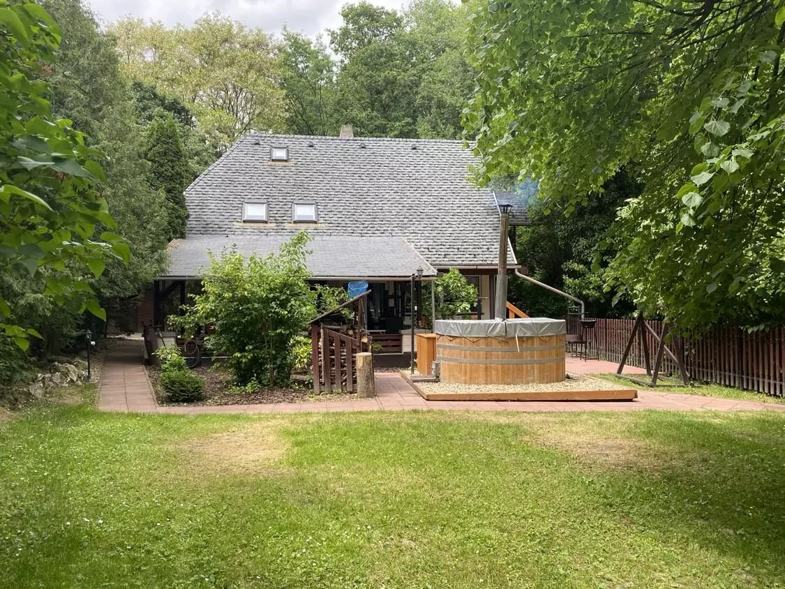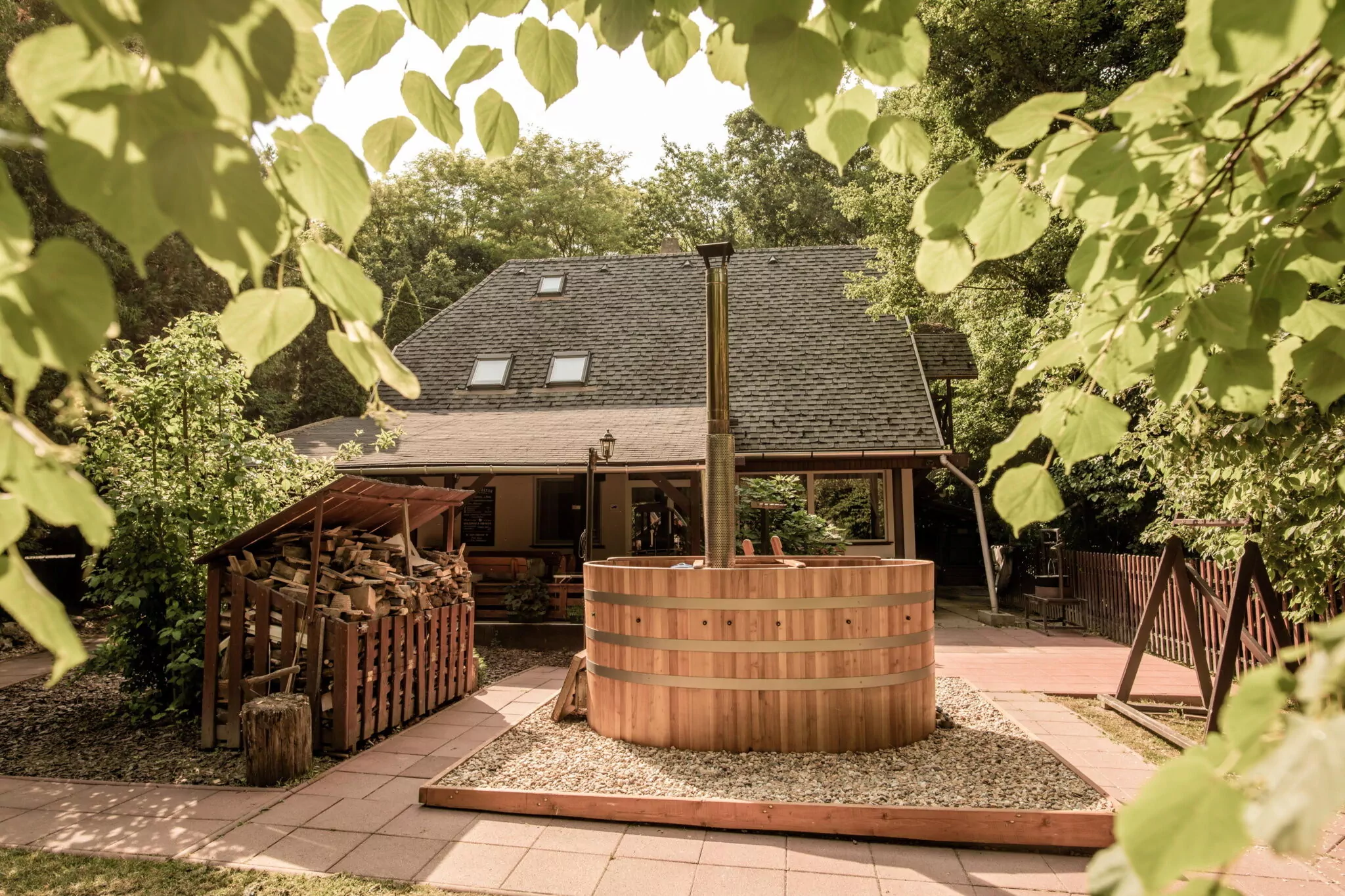 A ház udvarán található egy kemence, melyben ízletes és ropogós ételek készíthetők, valamint bográcsozásra, grillezésre, nyársalásra alkalmas hely is ki lett építve. Egy 10 személyes fürdődézsával is kedveskedünk vendégeinknek, hogy az itt eltöltött időt még nyugodtabbá, tökéletesebbé varázsoljuk. A kertben végigcsobogó patak látványa pedig megkoronázza mindenki számára ezt az élményt. Az udvar a gyerekek számára is tökéletes kikapcsolódást nyújt köszönhetően a játszótérnek, ahol hinták, csúszda, homokozó, trambulin, interaktív tábla várja őket. És nem utolsó sorban a patak másik oldalán található kis játszóházunk igazi szórakozást biztosít a kisebb és nagyobb gyerekek számára is, ahol minden korosztály talál magának elfoglaltságot.