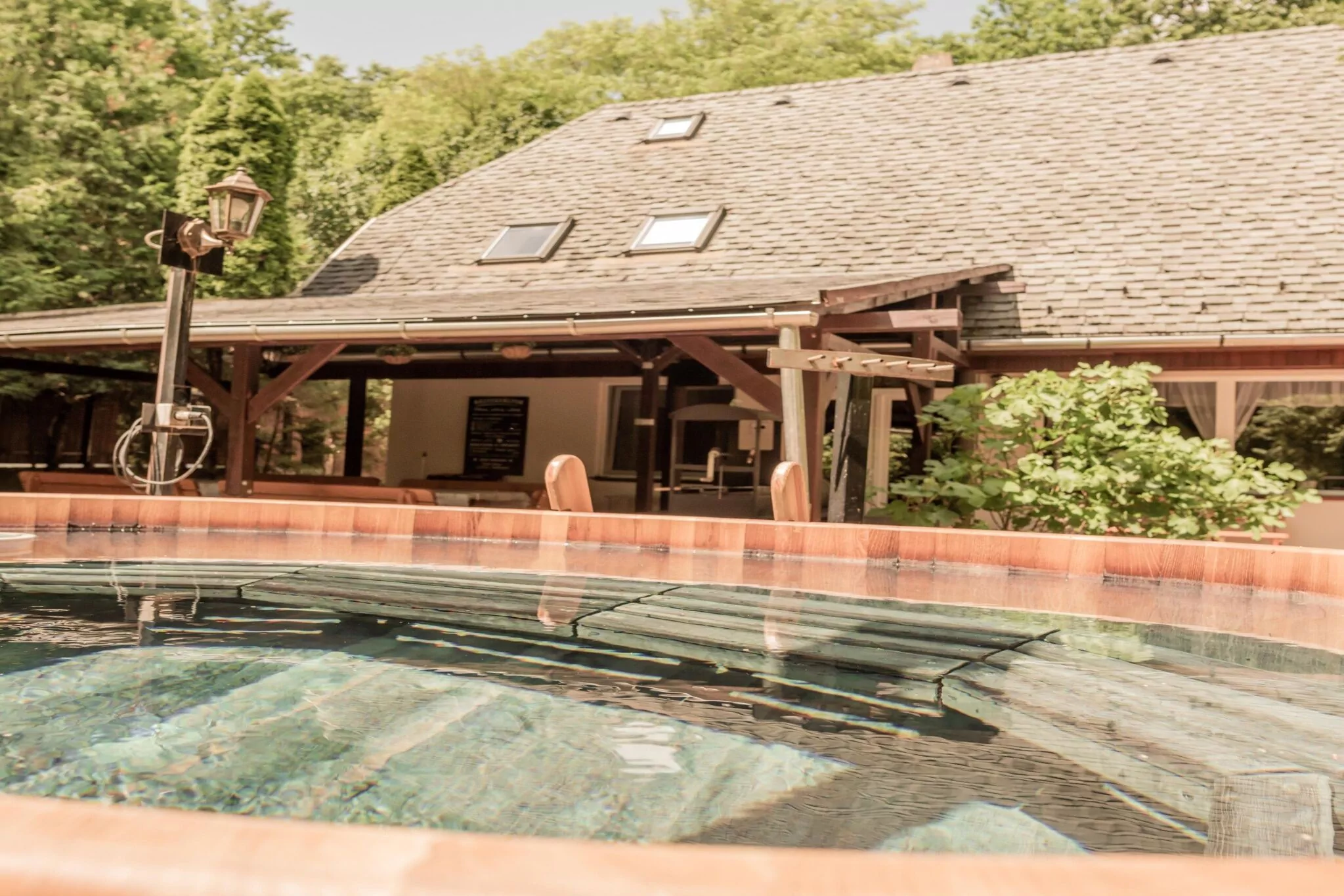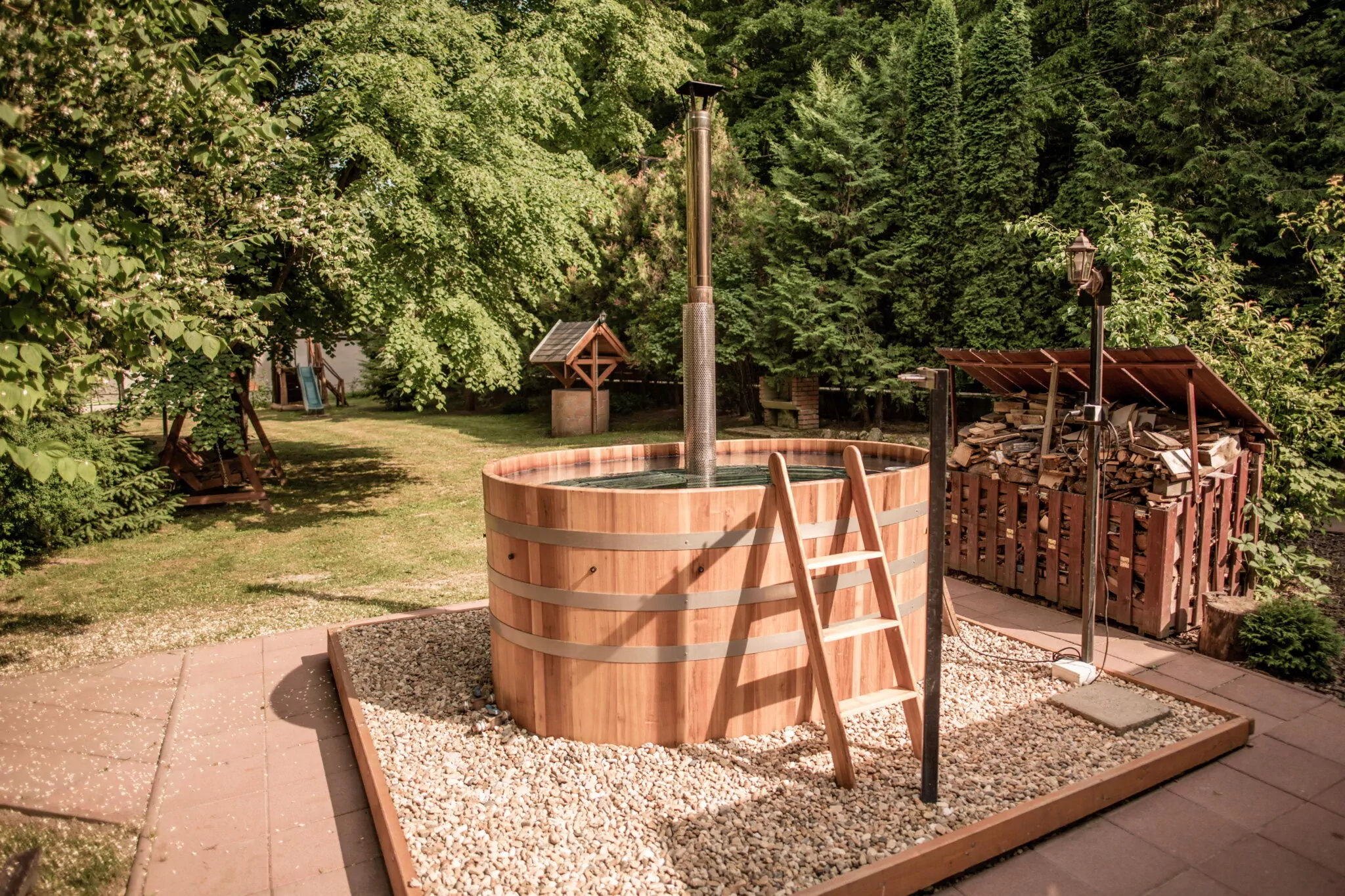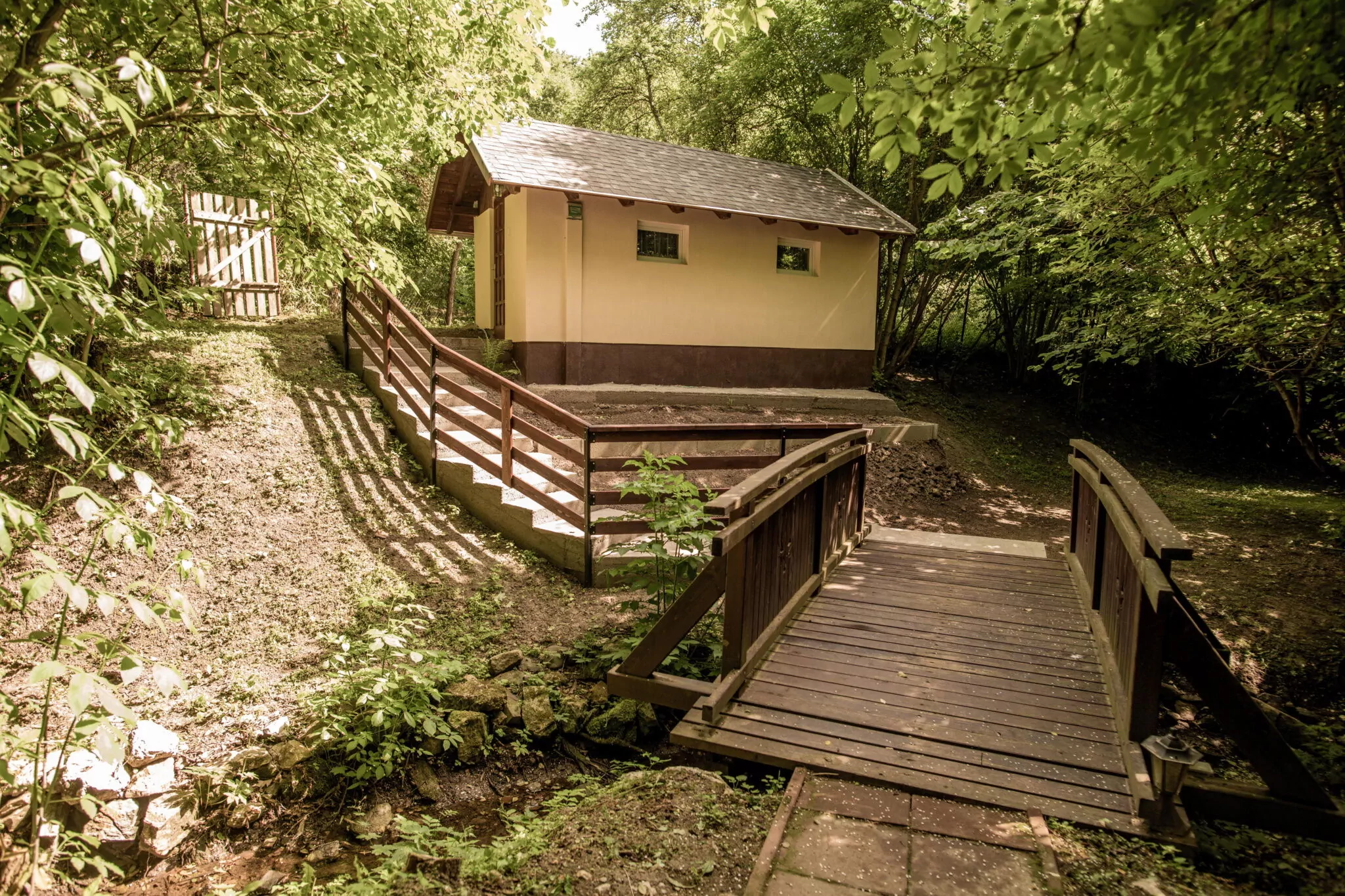 A ház udvarán található egy kemence, melyben ízletes és ropogós ételek készíthetők, valamint bográcsozásra, grillezésre, nyársalásra alkalmas hely is ki lett építve. Egy 10 személyes fürdődézsával is kedveskedünk vendégeinknek, hogy az itt eltöltött időt még nyugodtabbá, tökéletesebbé varázsoljuk. A kertben végigcsobogó patak látványa pedig megkoronázza mindenki számára ezt az élményt. Az udvar a gyerekek számára is tökéletes kikapcsolódást nyújt köszönhetően a játszótérnek, ahol hinták, csúszda, homokozó, trambulin, interaktív tábla várja őket. És nem utolsó sorban a patak másik oldalán található kis játszóházunk igazi szórakozást biztosít a kisebb és nagyobb gyerekek számára is, ahol minden korosztály talál magának elfoglaltságot.