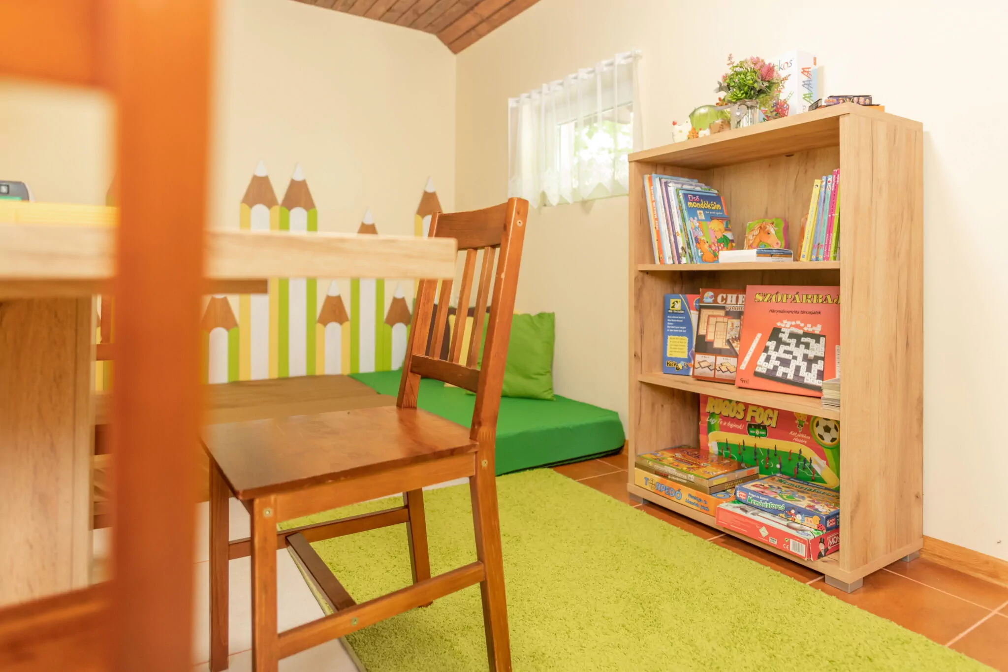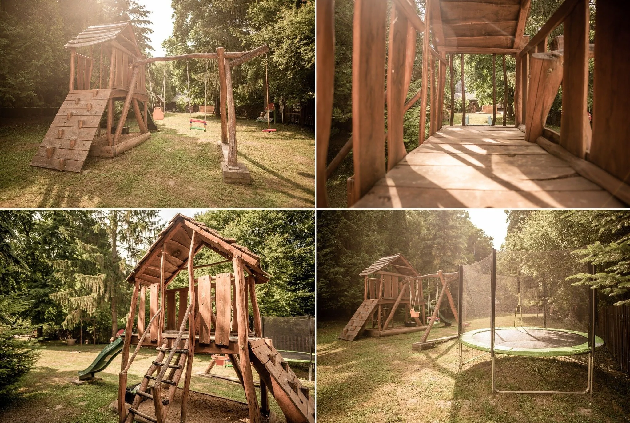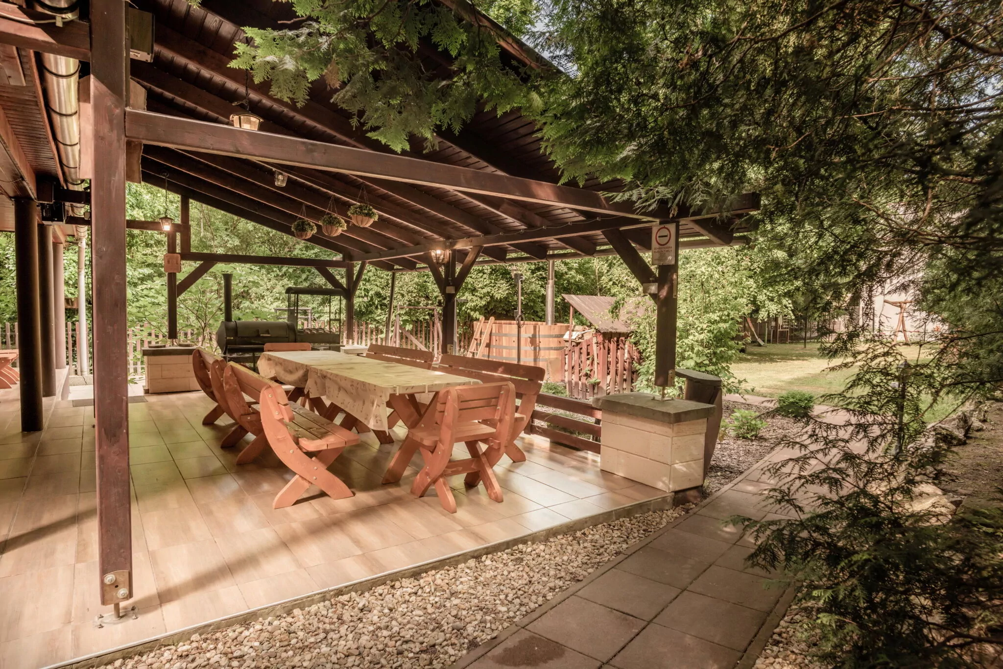 - kerti bútor, fürdődézsa, kemence, bográcsállvány, nyársbot, tollas ütő, fa a tűzrakáshoz, grill, pingpong asztal, játszótér, interaktív táblák