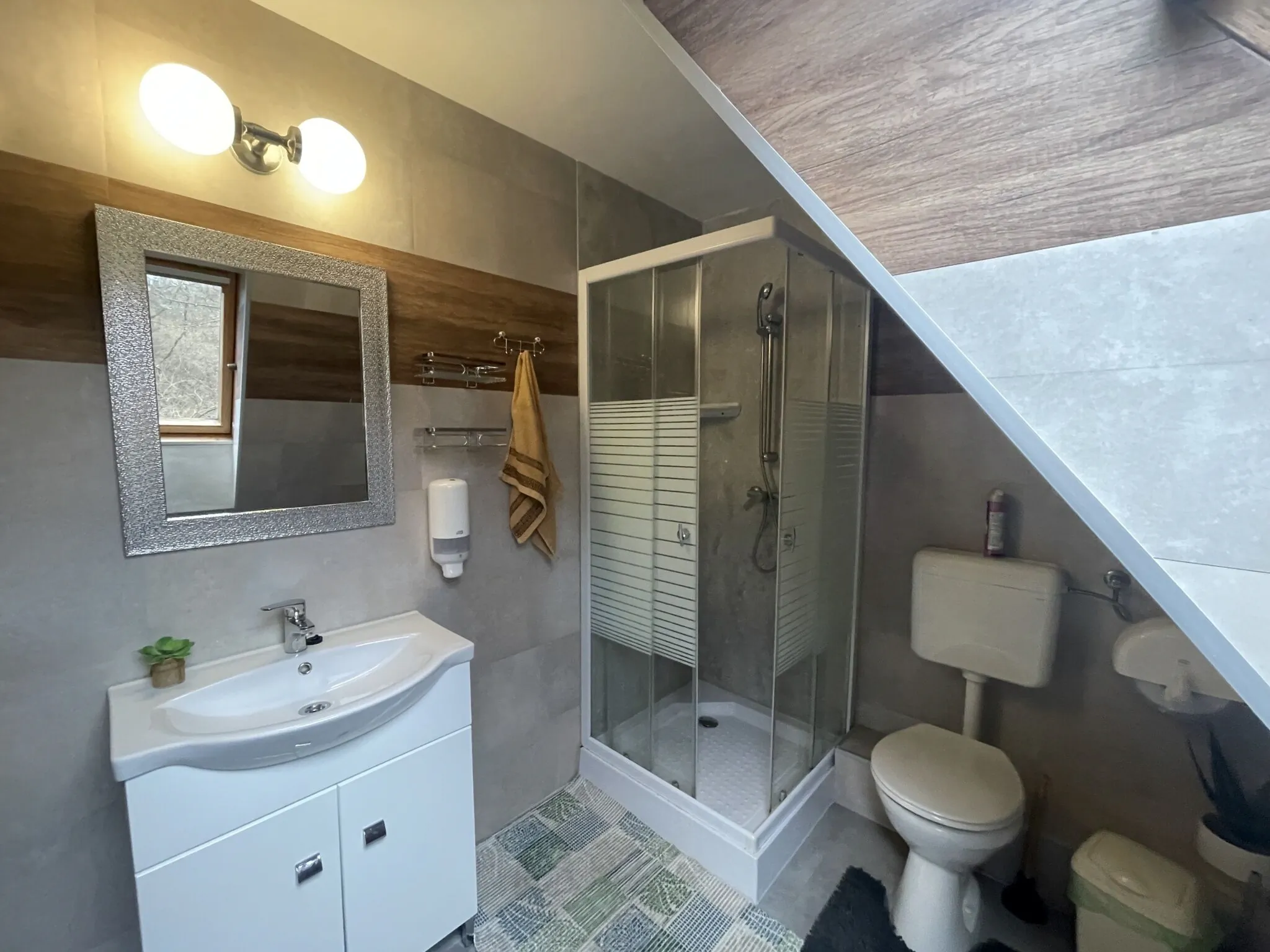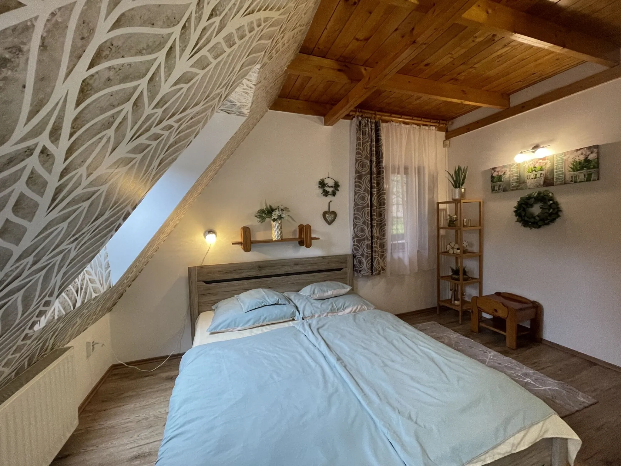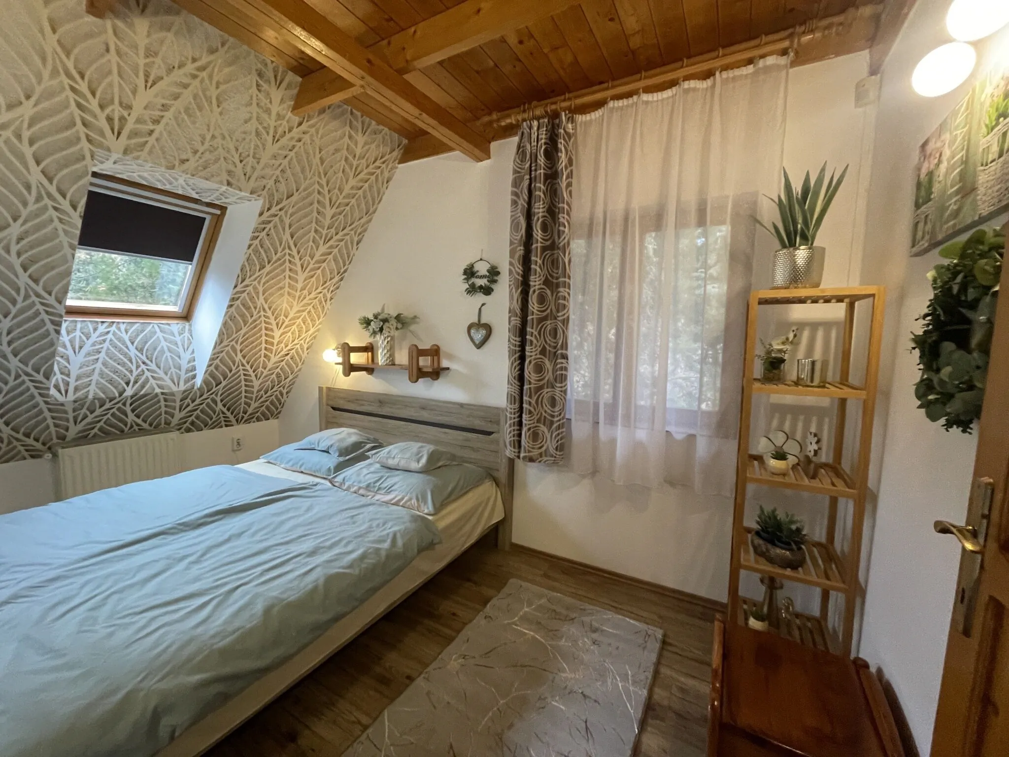 A felső szinten két szoba áll a vendégek rendelkezésére, valamint egy fürdőszoba. A kisebb szoba 2 ágyas, a nagyobb szobában akár 4 fő is kényelmesen aludhat az ötletesen kialakított galériának köszönhetően. A szobához tartozik egy erkély is, amelyre kilépve az erdő csodás világa hever a lábunk előtt.