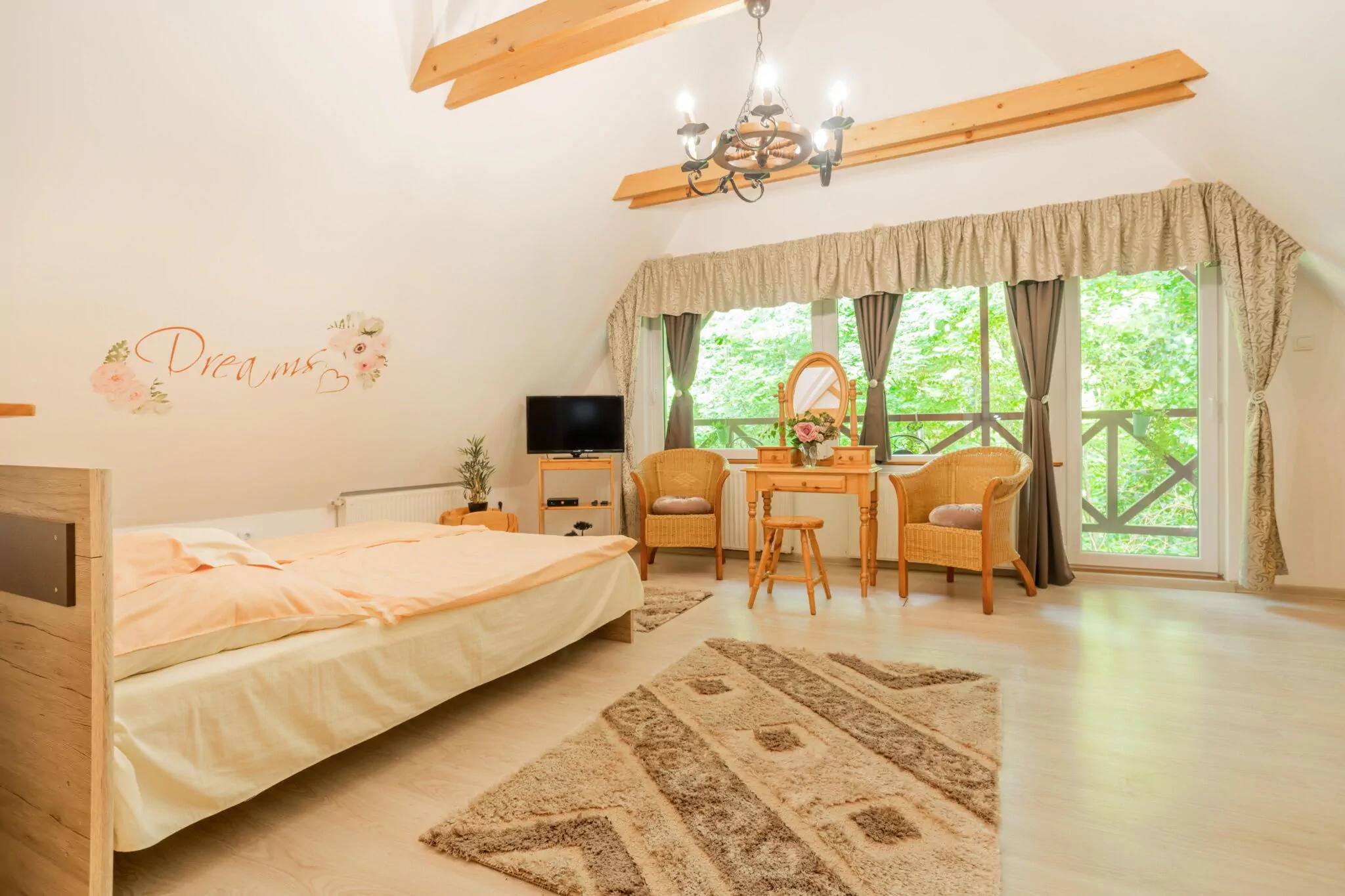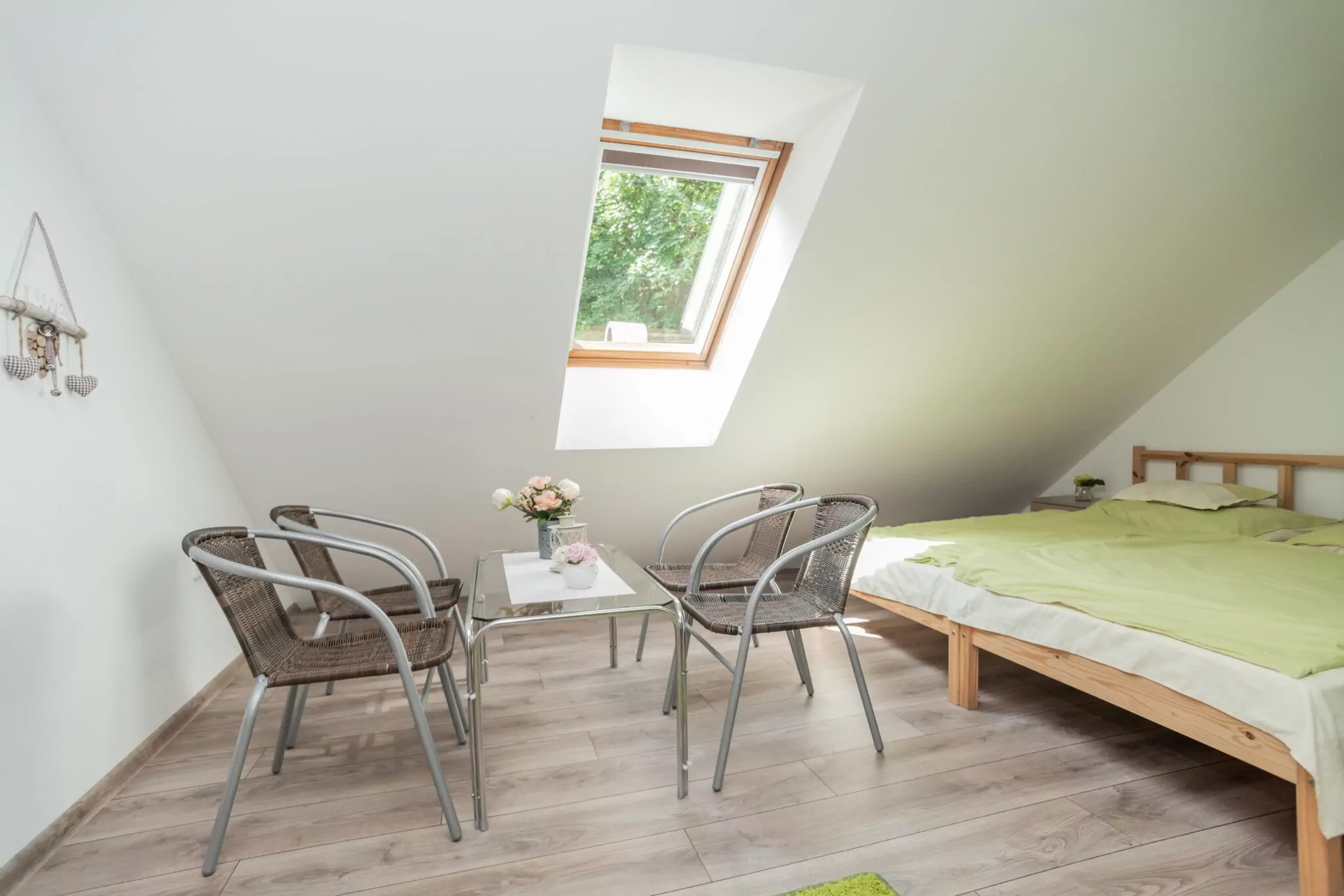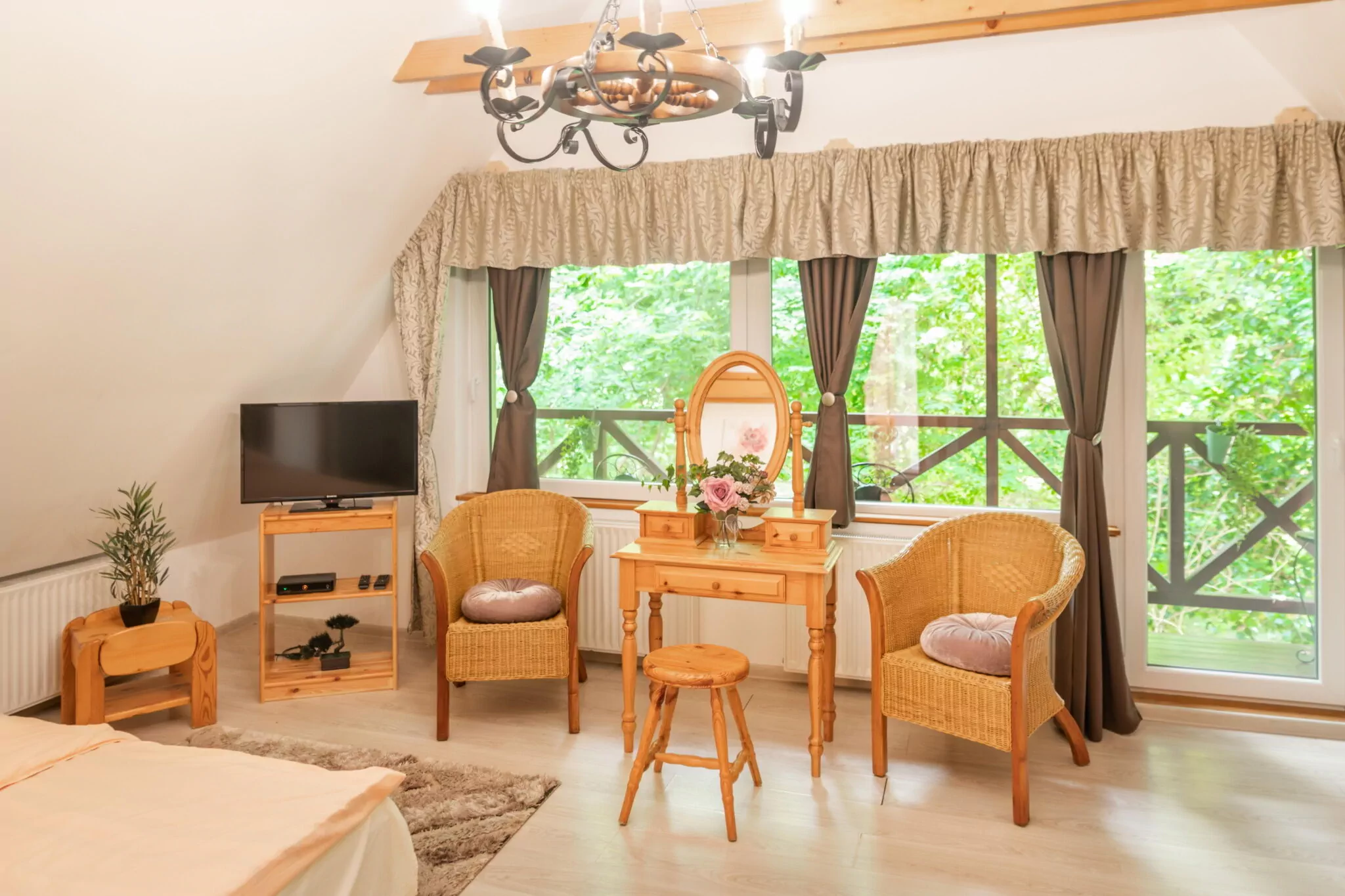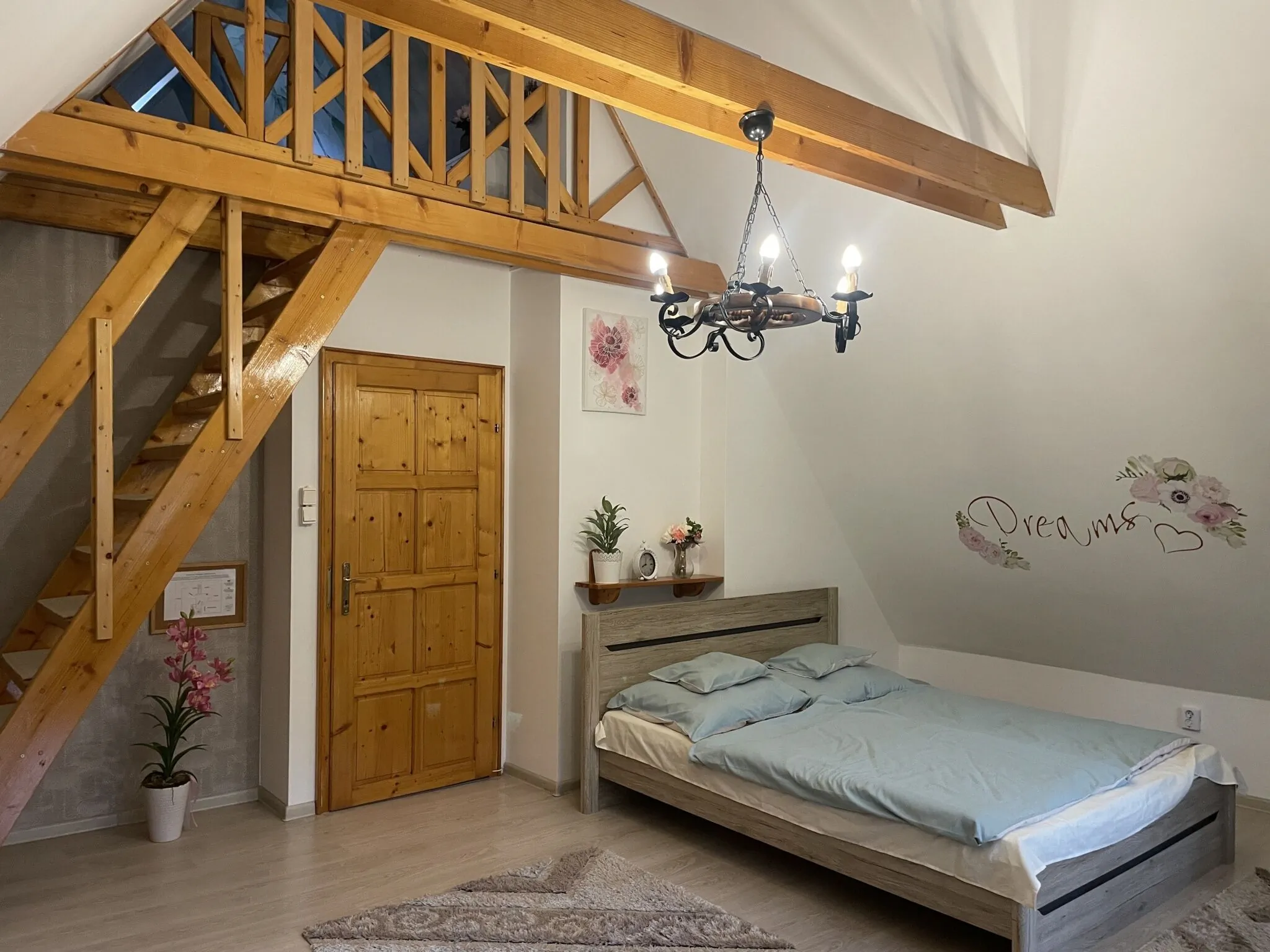 A felső szinten két szoba áll a vendégek rendelkezésére, valamint egy fürdőszoba. A kisebb szoba 2 ágyas, a nagyobb szobában akár 4 fő is kényelmesen aludhat az ötletesen kialakított galériának köszönhetően. A szobához tartozik egy erkély is, amelyre kilépve az erdő csodás világa hever a lábunk előtt.