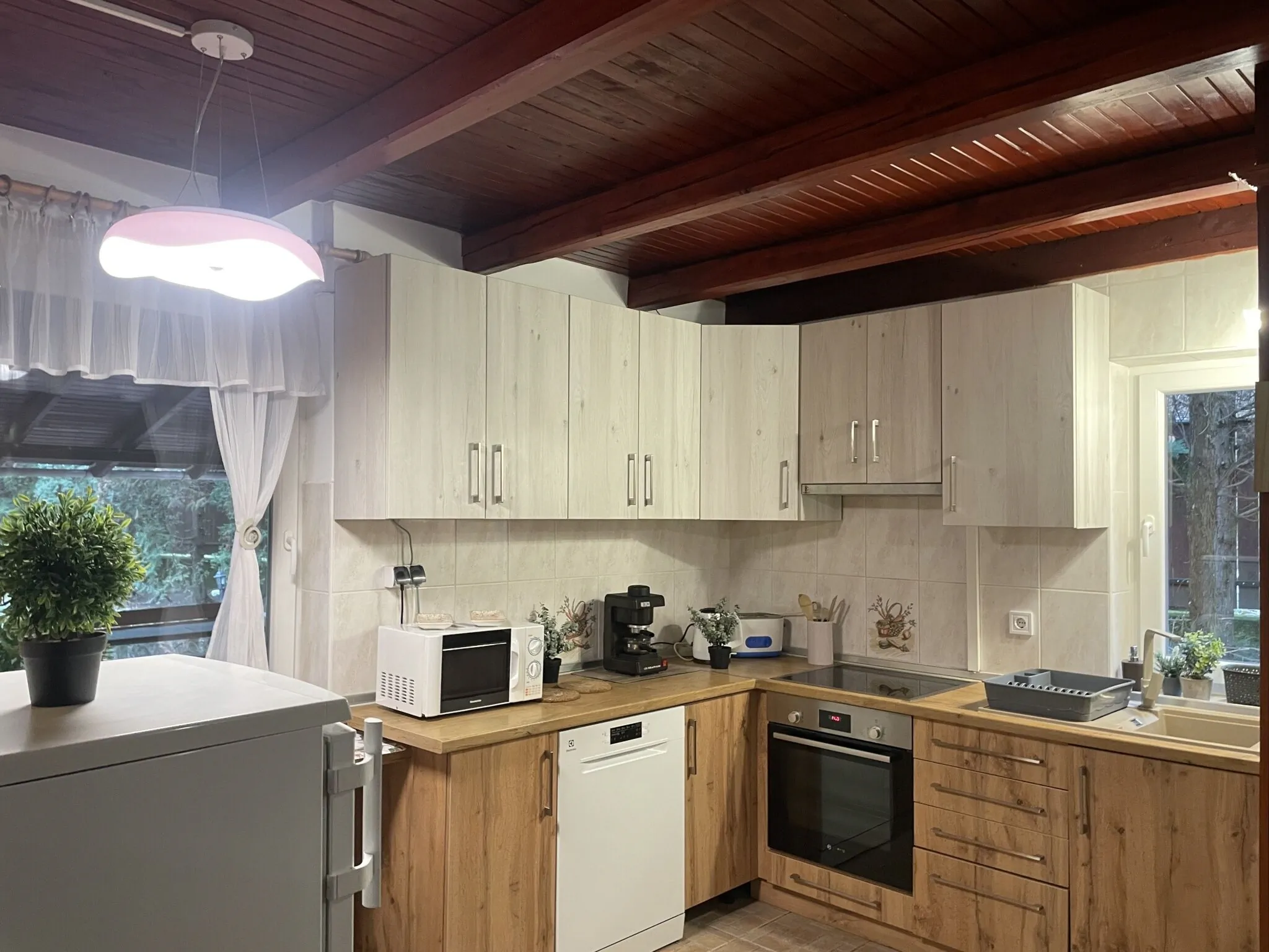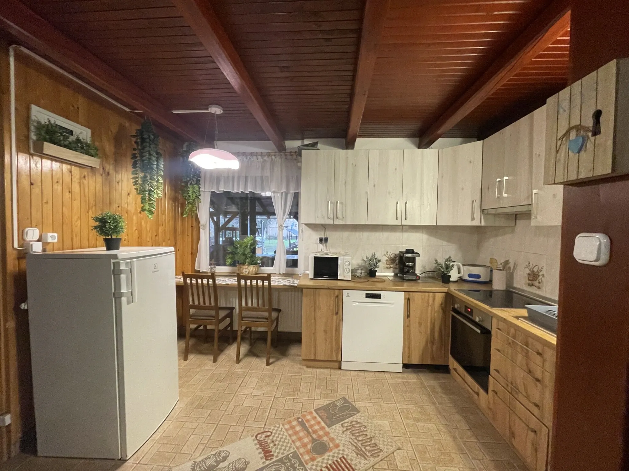 - tűzhely, mikrohullámú sütő, hűtő, edények, evőeszközök, kenyérpirító, vízforraló, kávéfőző, mosogatógép