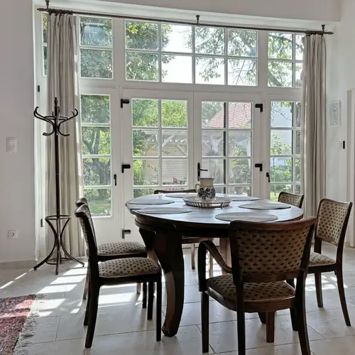 A hatfős Házban két kényelmes franciaágyas hálószobát találtok, mindegyiknek saját fürdőszobája van. A tágas nappali további két fő számára pótágyazható, a teljesen felszerelt, gépesített konyha pedig ideális a családi vagy baráti közös főzésekhez. A bejárat előtti terasz, melyet egy hatalmas hársfa árnyékol, tökéletes helyszín a reggeli kávéhoz vagy az esti borozgatáshoz.