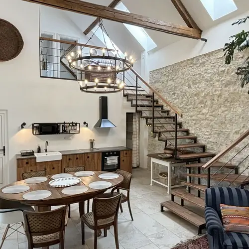 A hatfős Pajta különlegessége a 6 méter belmagasságú nappali, amelynek tágas terében kapott helyet a konyhapult, az étkezőasztal és a téli estéket meghitté varázsló kandalló illetve két kanapé, amiből az egyik két főre ágyazható. Az emeleti két franciaágyas hálószobából lenyűgöző kilátás nyílik a környező dombokra.