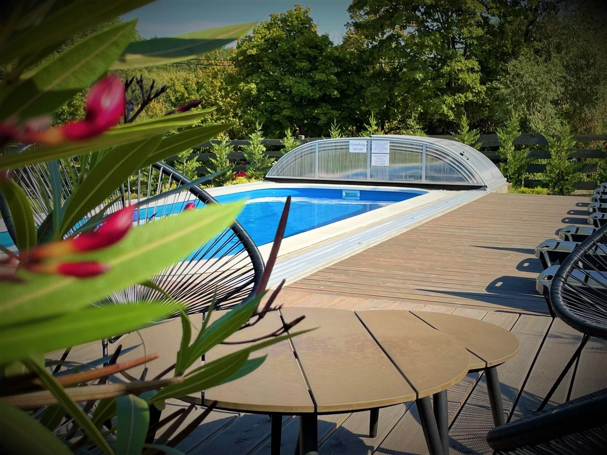 A faházak melletti közösségi téren található a szezonális, fűtött, sós vizű, fedett úszómedence, napozóterasz napozóágyakkal és napernyővel, valamint a játszótér. A közösségi téren mindkét vendégház vendégei kötöttségek nélkül tartózkodhatnak.