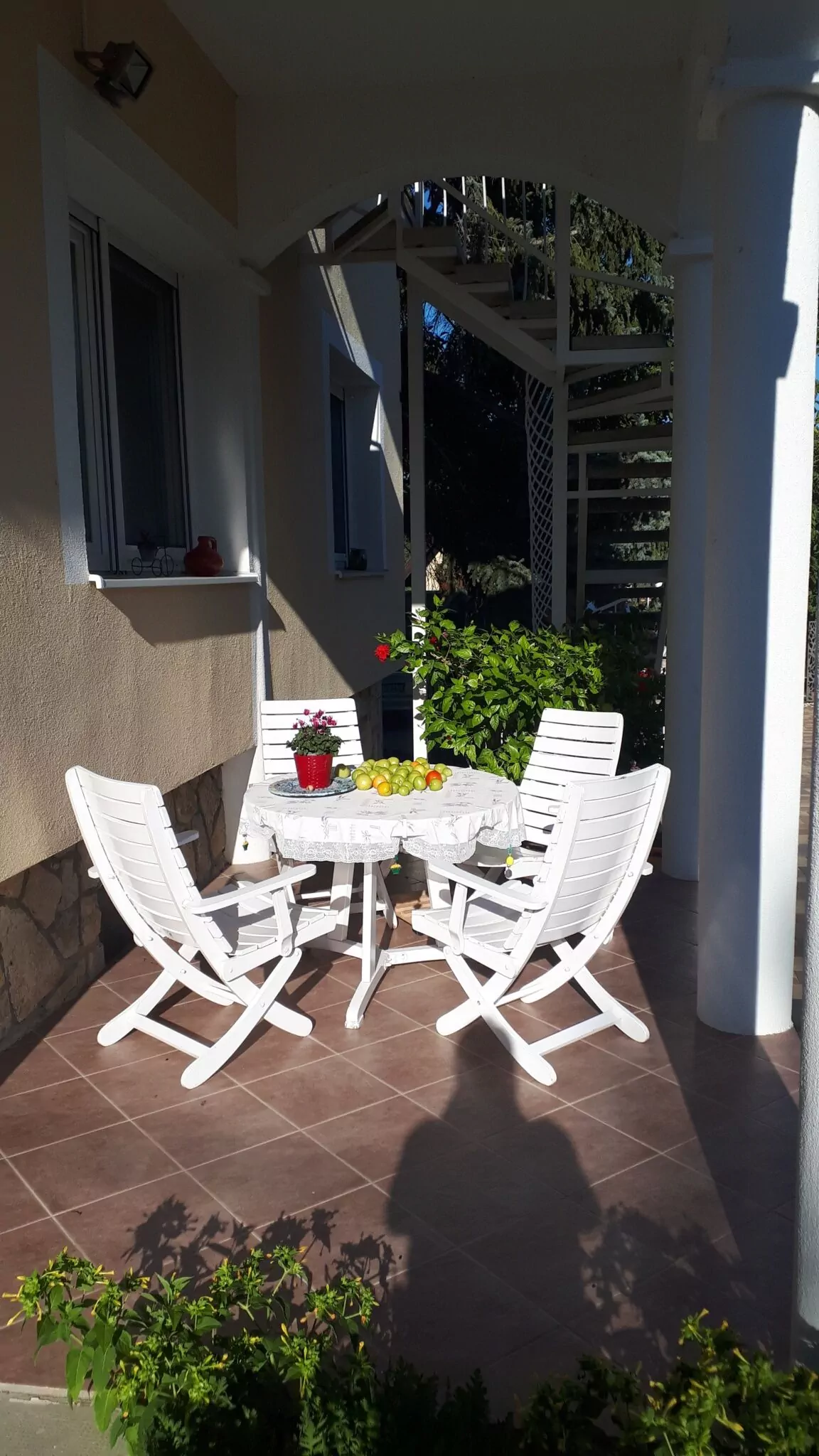 A vendégek az udvarban kialakított két parkoló helyen parkolhatnak az autójukkal. A szépen kivitelezett külső feljáratról nagy fedett teraszra érkezünk. Innen egy tágas és világos, klímával, tv és rádió készülékkel, kisebb könyvtárral, nagyobb tükörrel, 3 részes ülő garnitúrával rendelkező hangulatos étkező nappaliba léphetünk. Az ülőgarnitúrához egy kis kerek asztal tartozik. Fehér szekrénysor, nagy étkező asztal és 6 modern szék van még ebben helyiségben.