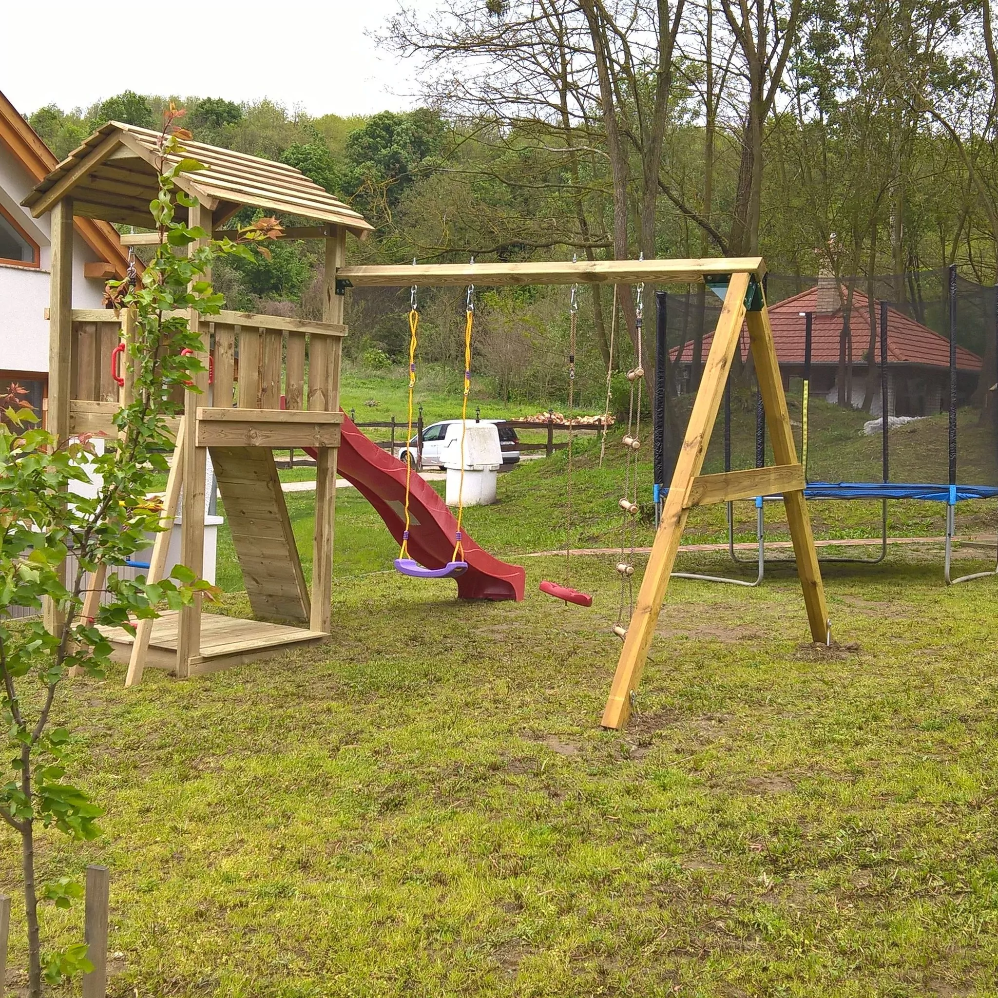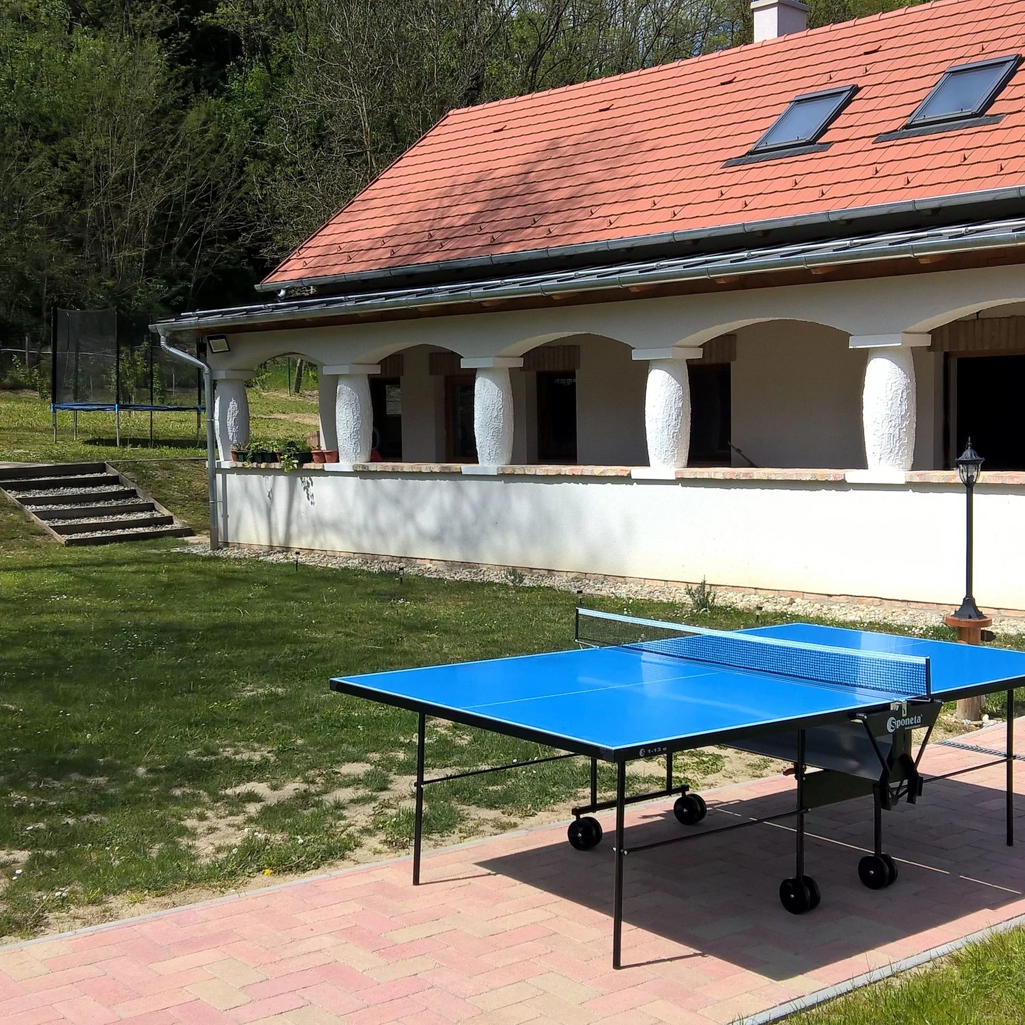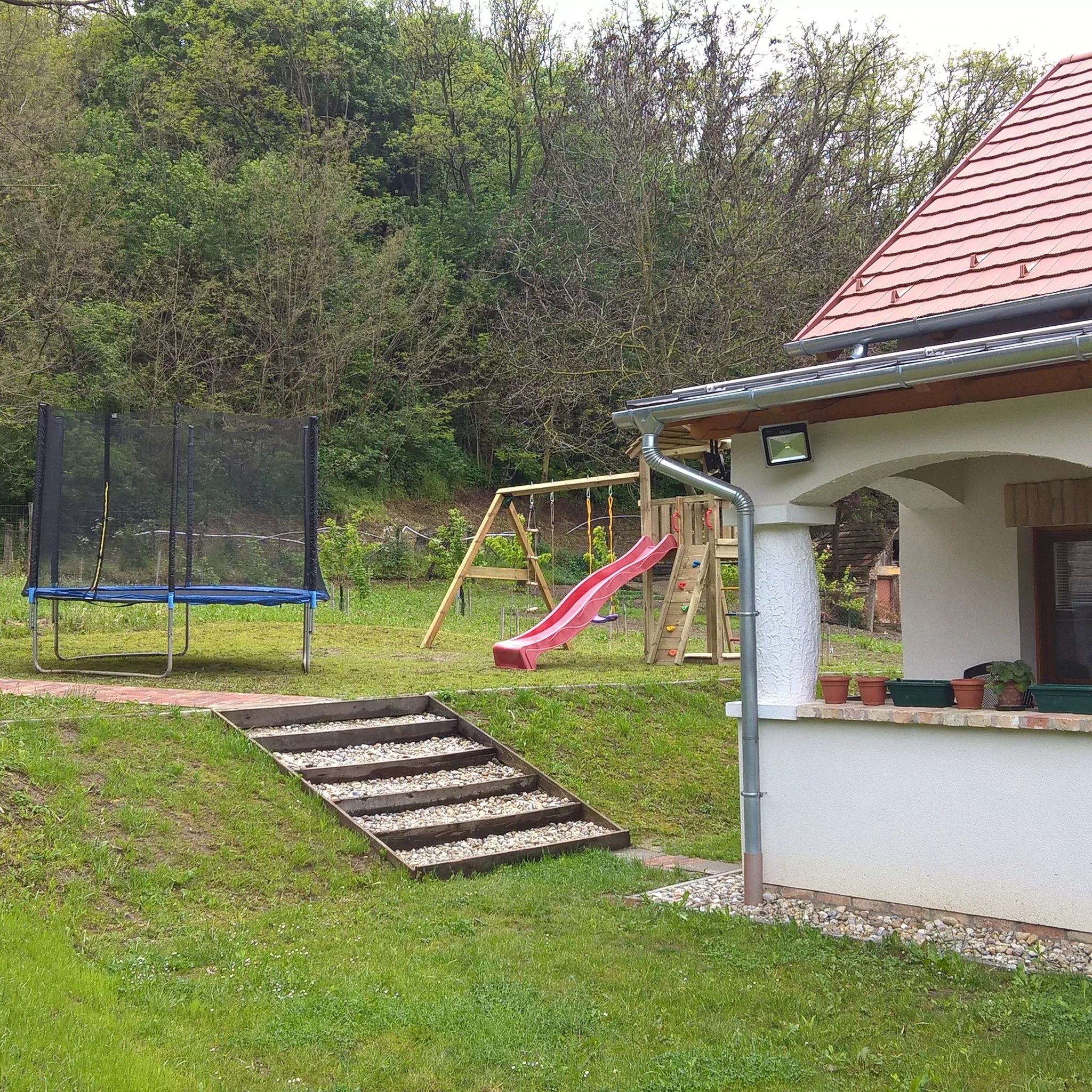 A járdát a korábbi szórt kavicsos helyett téglakövesre cseréltük, felépítettünk egy szerszámtárolót, továbbá kialakítottunk egy szalonnasütőt, ahol bográcsozásra is lehetőség nyílik. A gyerekeket játszótérrel kétféle csúszdával, mérleghintával, homokozóval, hintákkal, kötélhágcsóval és trambulinnal várjuk.  A házban széles sávú internet rendelkezésre áll. Okos televízióink, illetve androidos tv-ookosítók állnak rendelkezésre a streaming szolgáltatások, valamint a több mint 100 csatornával rendelkezésre álló sweet.tv szolgáltatás eléréséhez.