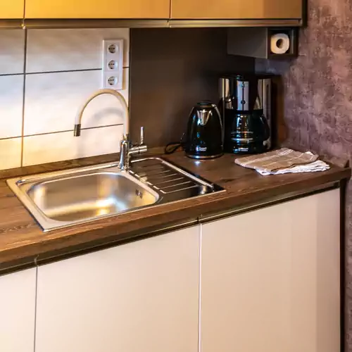 Konyha: Teljesen felszerelt, tűzhely, sütővel, páraelszívó, mikró, hűtőszekrény (fagyasztó nélküli), kávéfőző, vízforraló, kenyérpirító, fűszerek.
