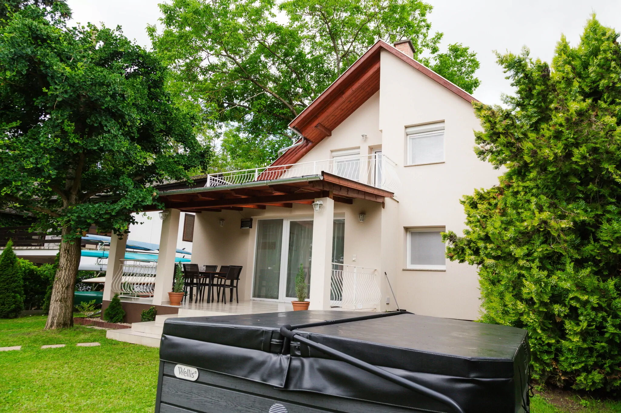 A főbejáraton kilépve egy 30 m2-es, fedett teraszra érkezünk, ahol egy 6 személyes kerti ülőgarnitúra igyekszik a pihenésünket szolgálni. A terasz mellett közvetlenül egy 5 fős Wellis Budapest Premium Life jakuzzi található, mely használatát az ár tartalmazza. A ház mögött egy kerti sütő helyezkedik el, amely alkalmas bográcsozásra, szalonnasütésre illetve grillezésre is. Nyársak illetve bogrács biztosított.