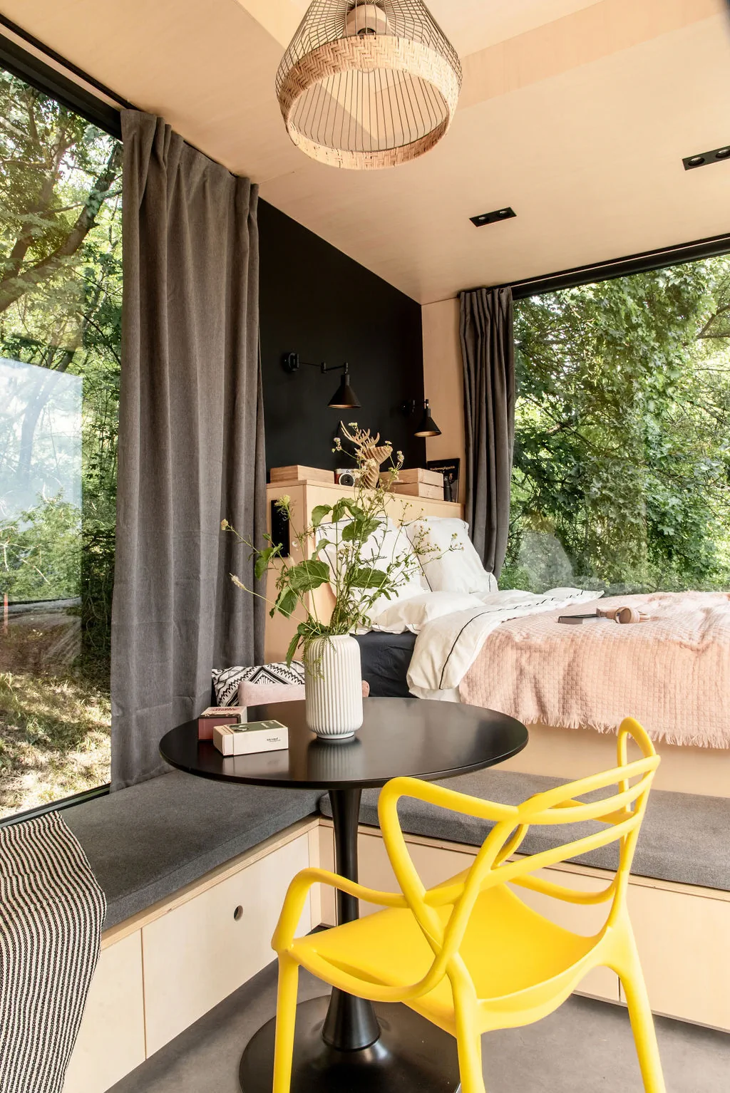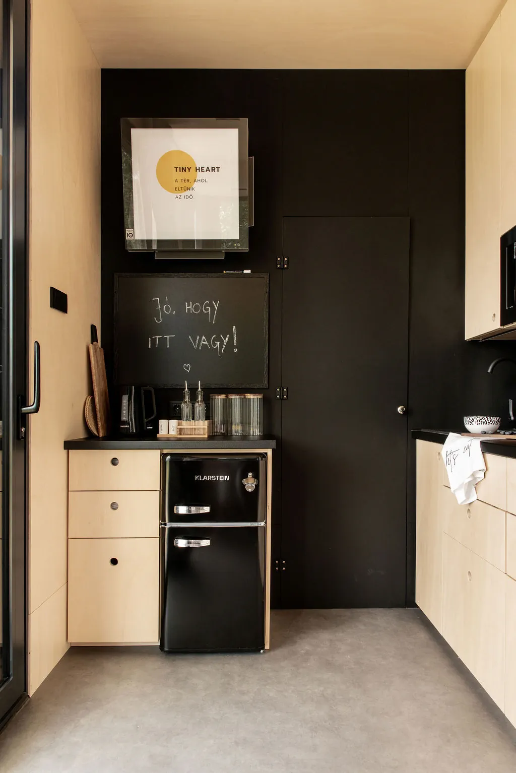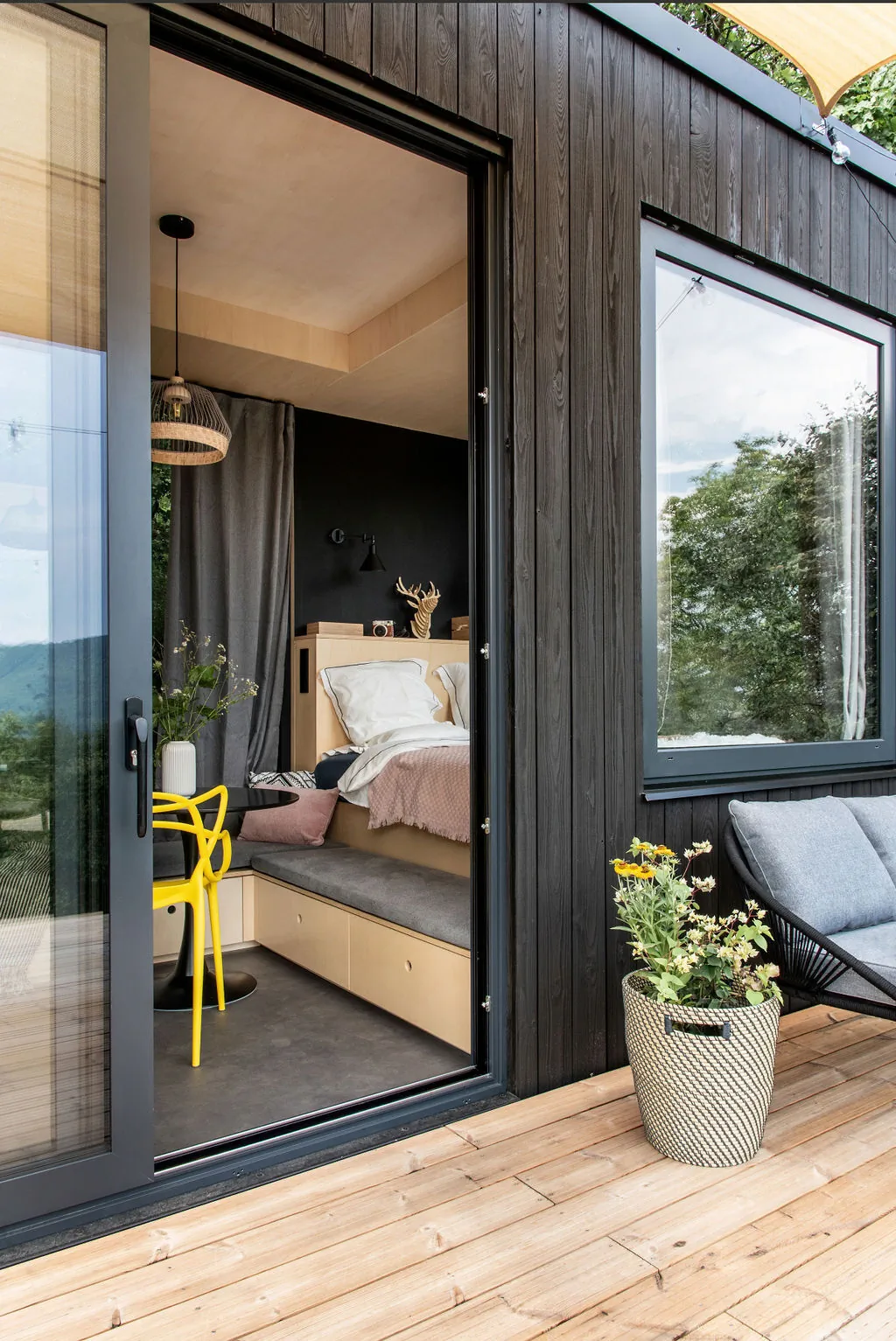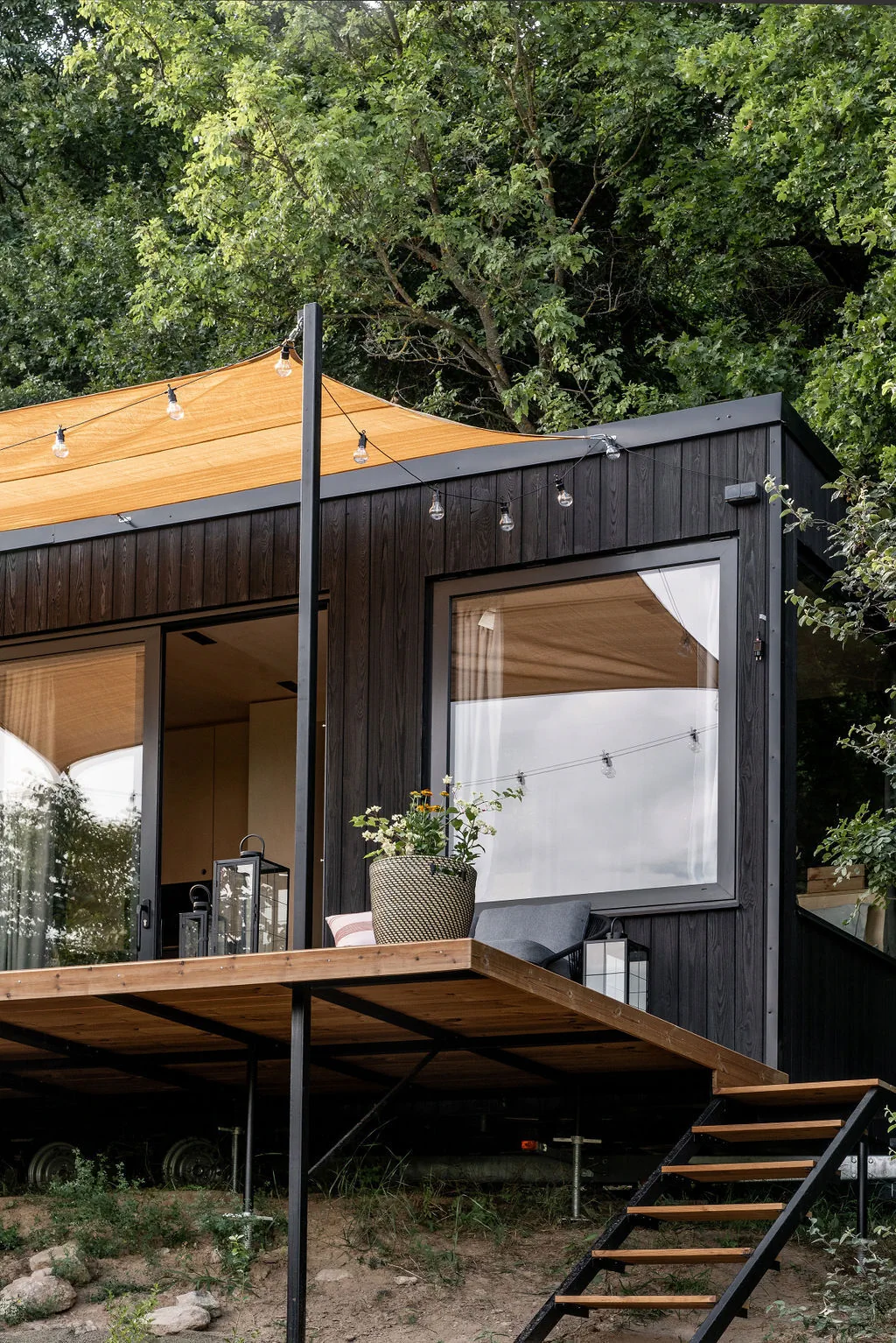Sok természetes és minőségi anyagot használtunk a tiny house megépítéséhez. A kabinnak a modern, minimál dizájn és okos tervezési megoldások ötvözete igazán különleges hangulatot ad.