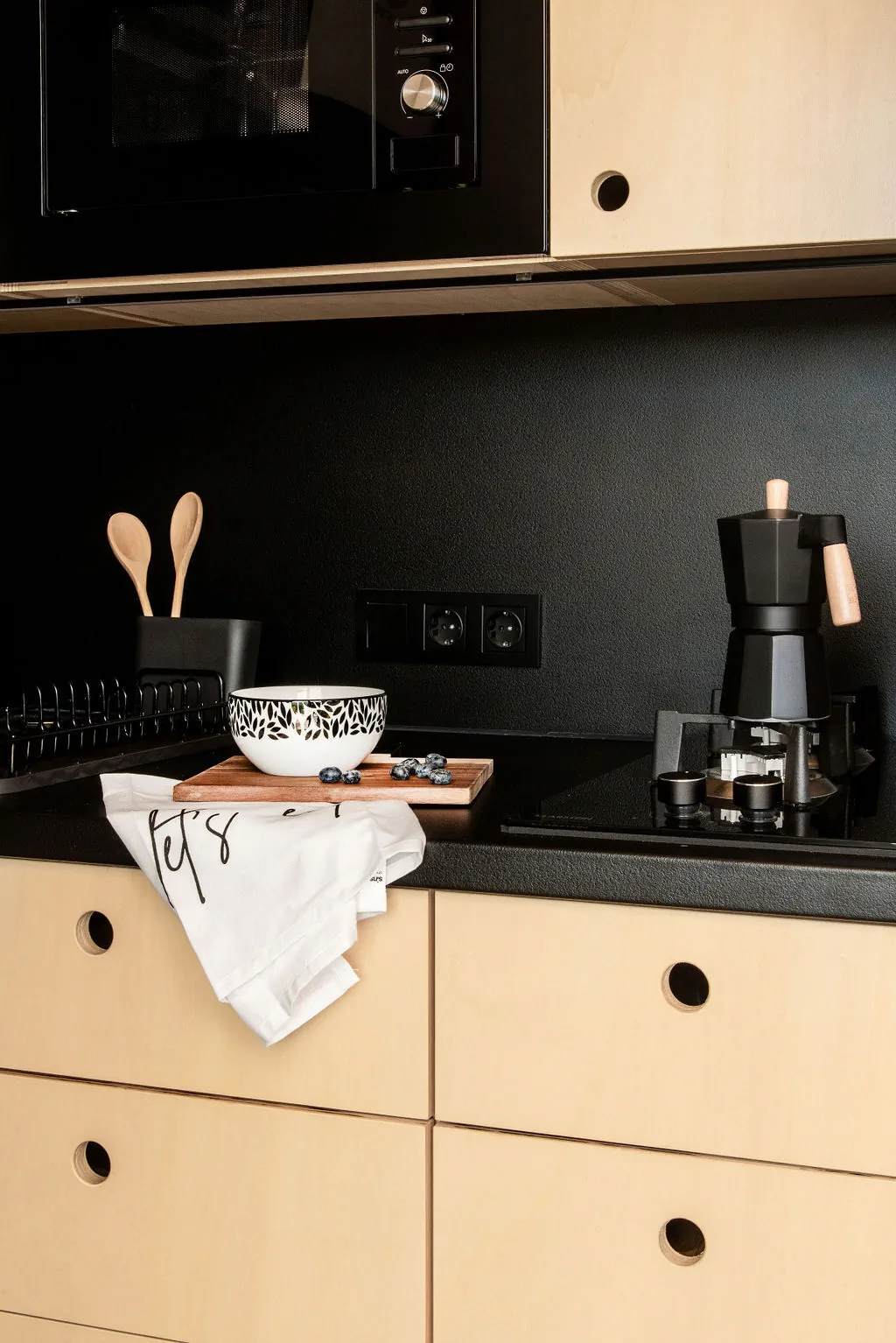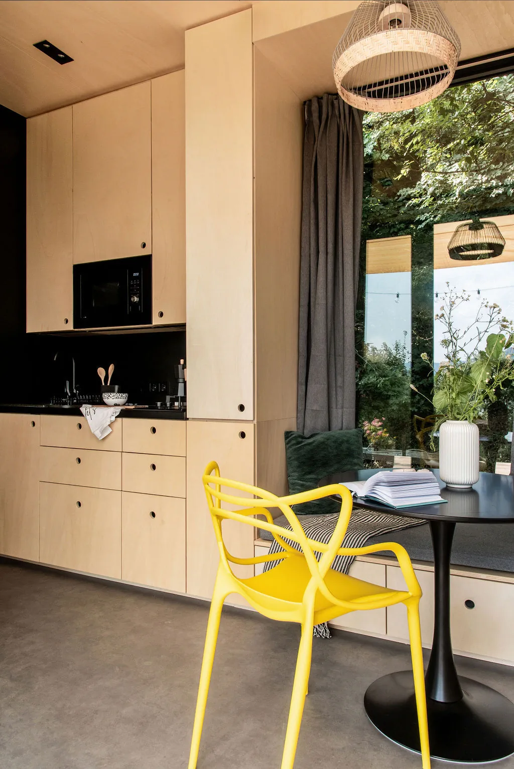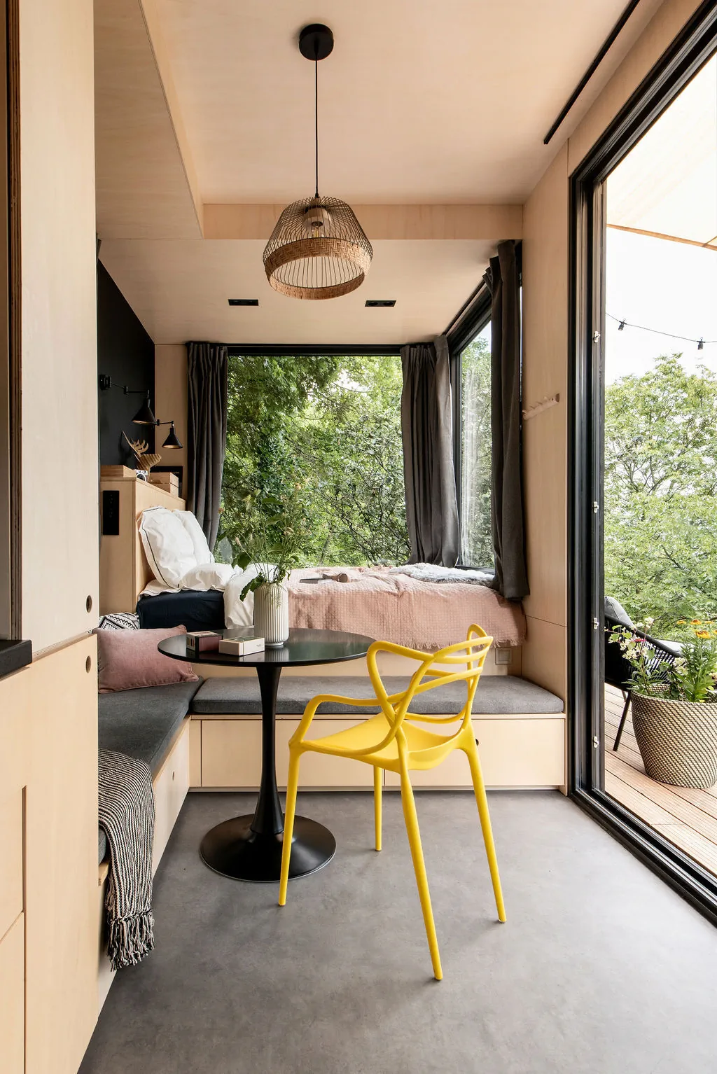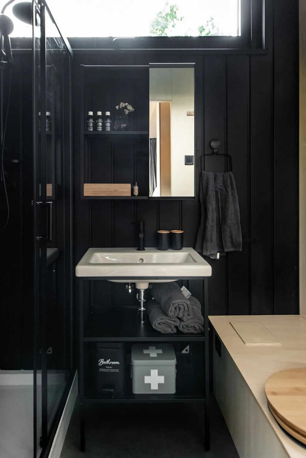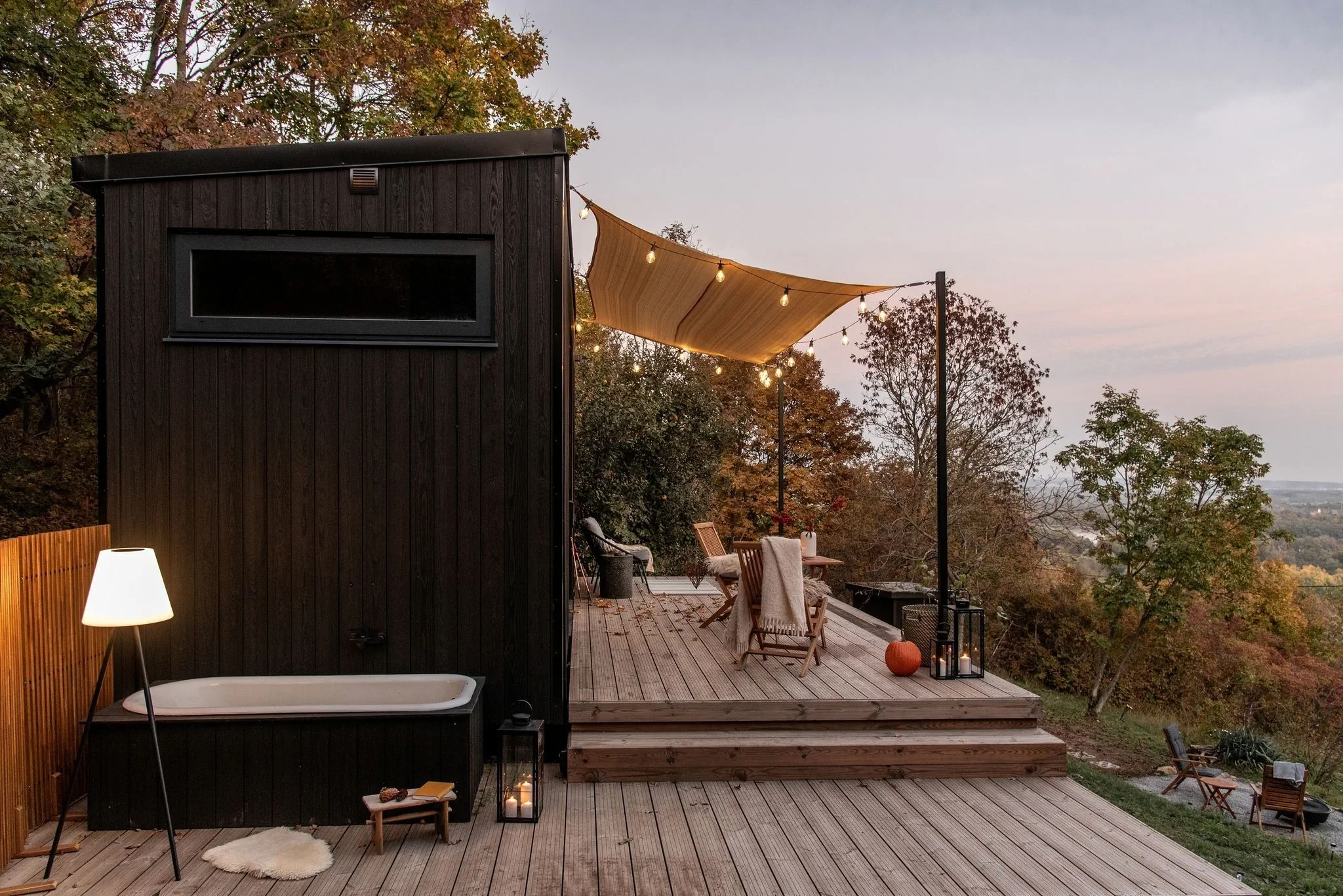 Sok természetes és minőségi anyagot használtunk a tiny house megépítéséhez. A kabinnak a modern, minimál dizájn és okos tervezési megoldások ötvözete igazán különleges hangulatot ad.