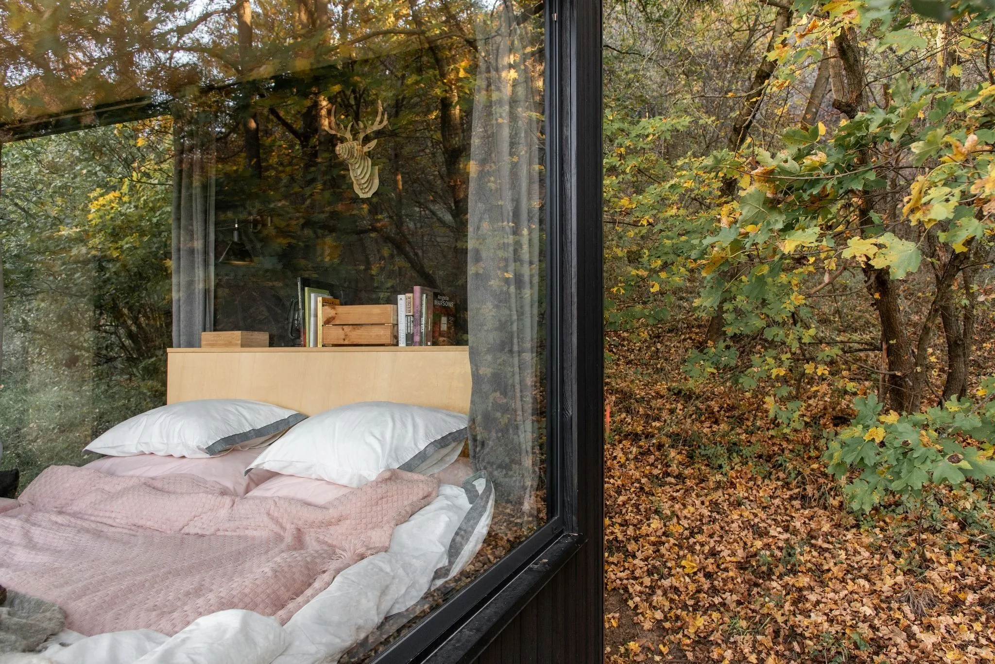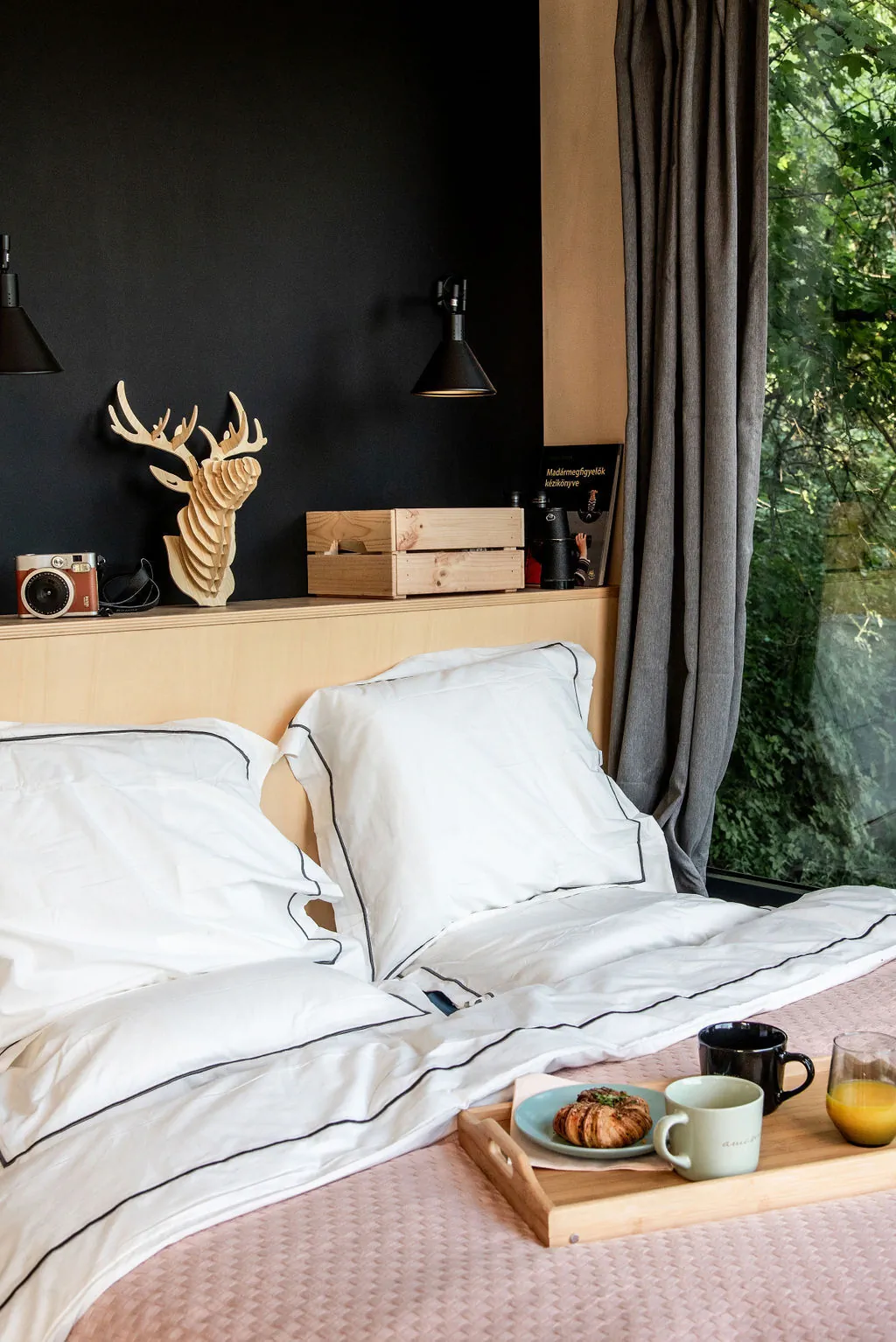 Szeretjük a szépséges külső égetett fa burkolatot, a belső tér világos nyírfa felületei és a fekete kiegészítők kontrasztját. Jó, hogy komfortos, mindennel felszerelt a konyha, kényelmes és nagy a zuhanyzó a fürdőben, de a legszuperebb mégis a panoráma ablakokkal körbevett hatalmas ágy. Az óriási üvegfelületeken át közel van a természetet, a kilátással együtt pedig tágas a tér.