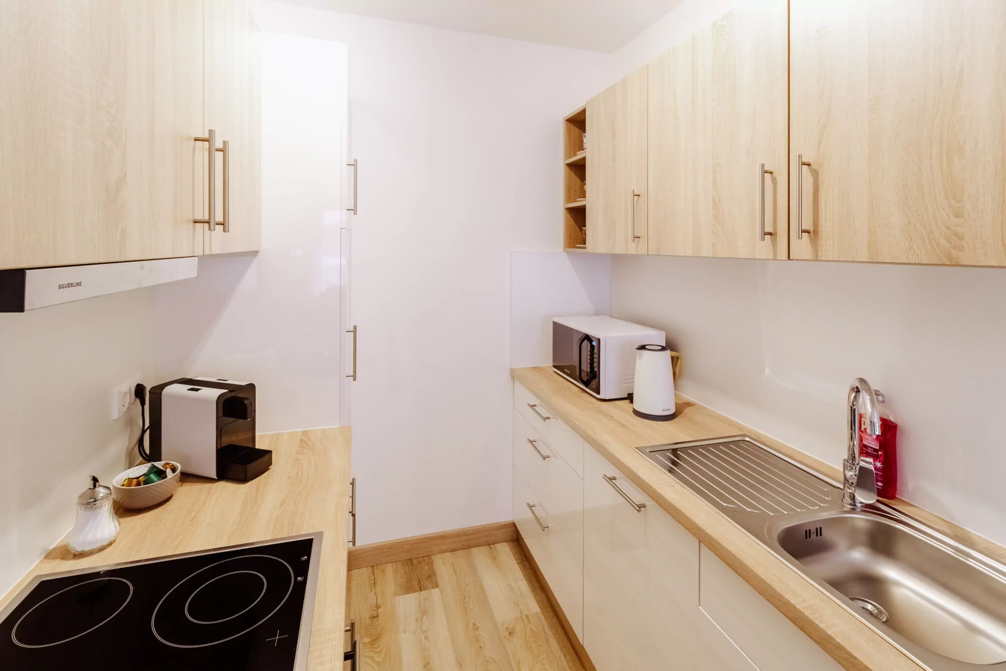 Mosogatógéppel ellátott, teljesen felszerelt konyha, étkezősarok, síkképernyős kábel-TV és saját, zuhanyzós fürdőszoba tartozik. Mikrohullámú sütő, hűtőszekrény, vízforraló és kávéfőző is biztosított.