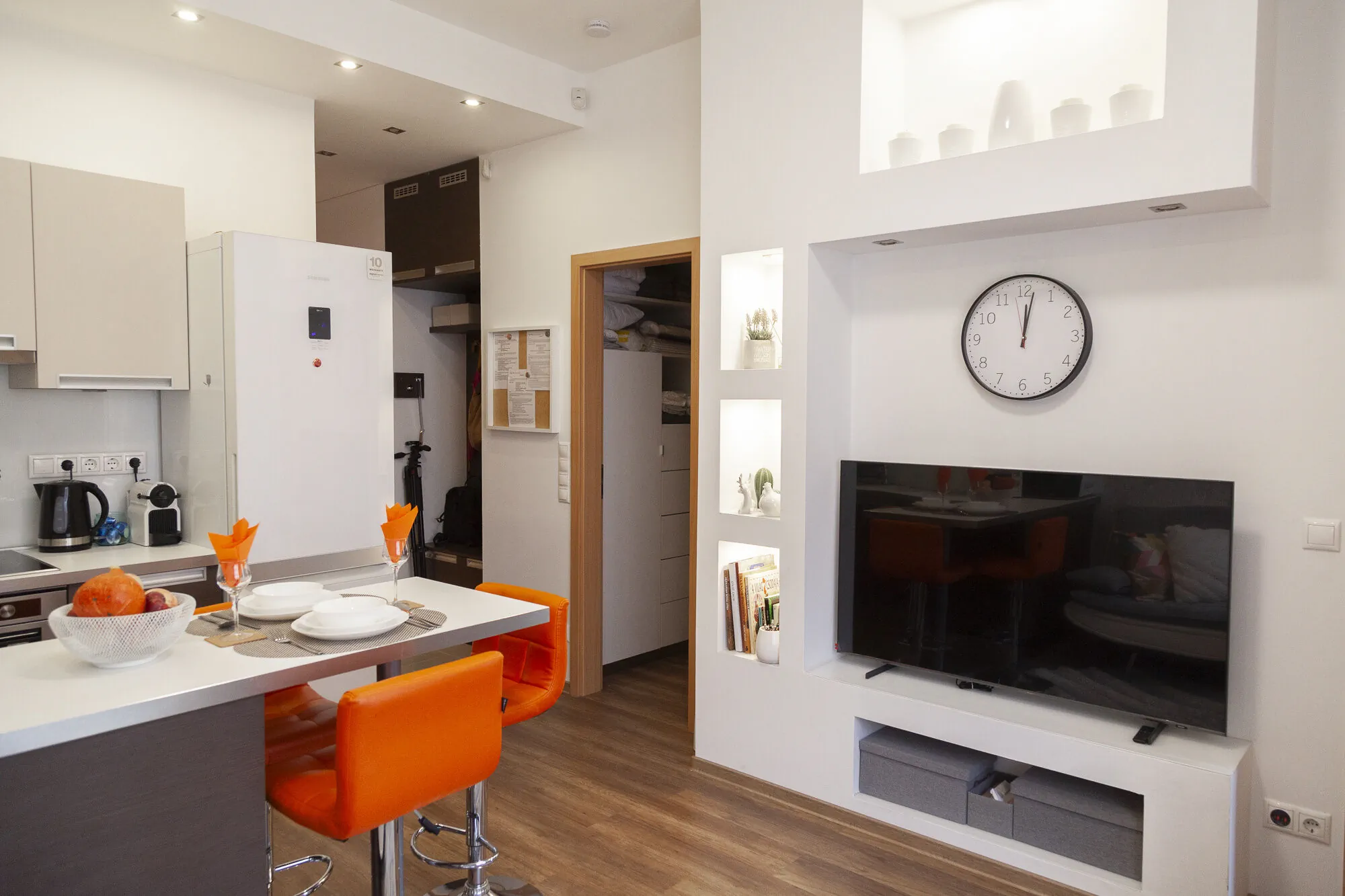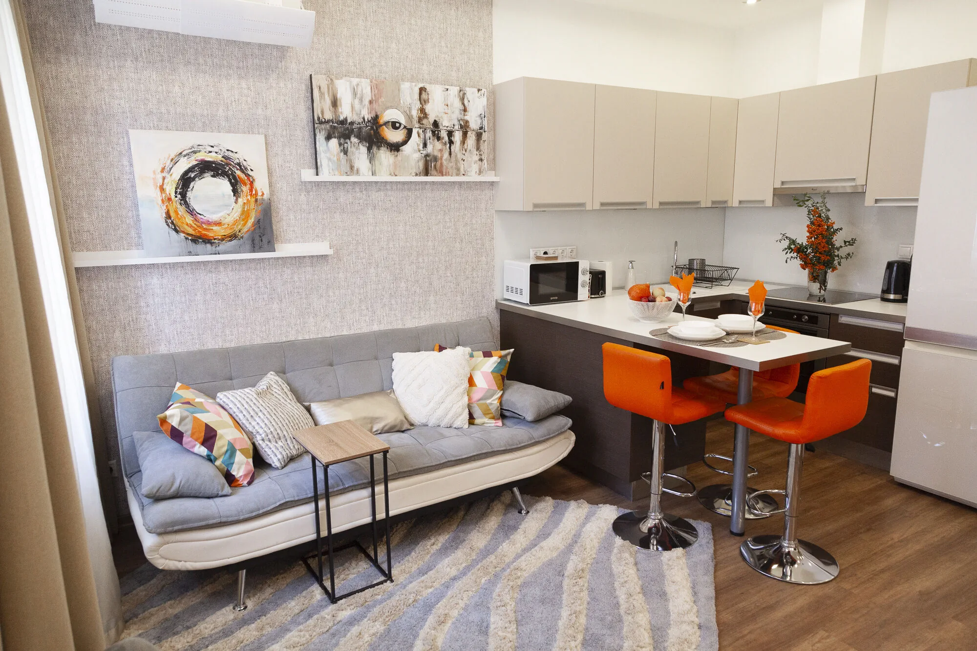 Modern kialakítású, teljesen felújított lakás az ötödik emeleten található. (lifttel). A lakás teljesen felszerelt és teljesen berendezett, modern stílusban légkondicionálóval, maximum 2 fő elszállásolására alkalmas.